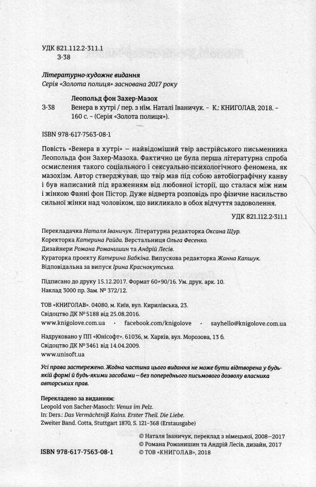 Повість «Венера в хутрі» — найвідоміший твір австрійського письменника Леопольда фон Захер-Мазоха. Фактично це була перша літературна спроба осмислення такого соціального і сексуально-психологічного феномена, як мазохізм. Автор стверджував, що твір мав під собою автобіографічну канву і був написаний під враженням від любовної історії, що сталася між ним і жінкою Фанні фон Пістор. Дуже відверта розповідь про фізичне насильство сильної жінки над чоловіком, що викликало в обох відчуття задоволення.