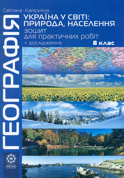 Посібник містить повний комплект матеріалів для виконання практичних і дослідницьких робіт з курсу «Україна у світі: природа, населення», передбачених чинною навчальною програмою для 8 класу. У зошиті наявні контурні карти, таблиці, схеми, діаграми; основний зміст доповнено пам'ятками та цікавими географічними фактами. Корисну додаткову інформацію надають посилання на Інтернет-ресурси. Призначено для учнів 8 класу загальноосвітніх навчальних закладів і вчителів географії.