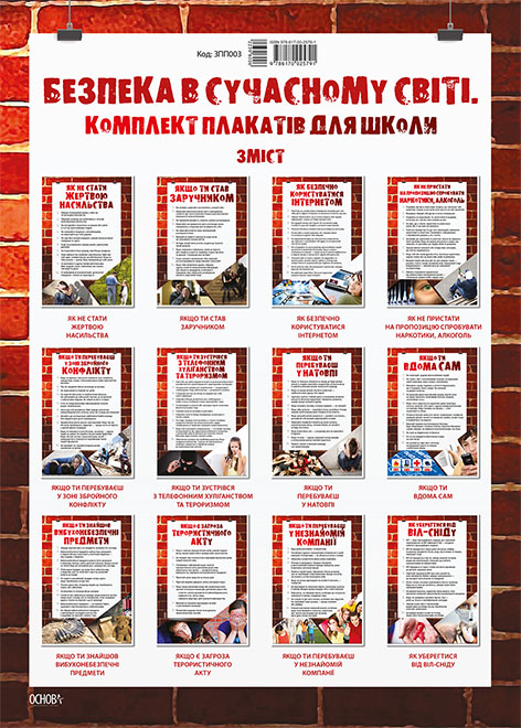 Комплект містить 12 плакатів, на яких стисло представлено правила поведінки в різноманітних небезпечних для дітей ситуаціях. Можуть бути використані для оформлення класних куточків, шкільних стендів, під час проведення бесід та інших заходів відповідної тематики.