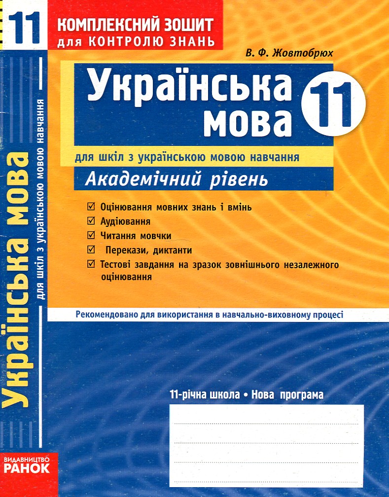 Комплексний зошит для кошрролю знань містить тестові контрольні роботи, питання до текстів з аудіювання, тексти для читання мовчки та питання до них, тексти для усних переказів, теми для створення власних висловлювань. Видання призначене для учнів 11 класу загальноосвітніх шкіл з українською мовою ла-Ечання.