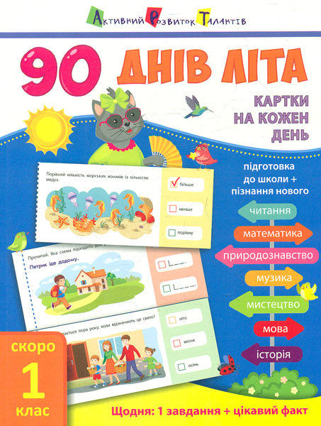 Тепер не потрібно вмовляти дитину займатися влітку! Із книгами «90 днів літа» можна за кілька хвилин на день повторити шкільний матеріал за попередній клас та розширити кругозір. Дізнавайтеся нове про українську та світову культуру, архітектуру, історію, науку, мистецтво. Опрацювання однієї картки займе не більше 5 хвилин на день. Як наслідок — дитина повторить вивчене і дізнається багато нового.