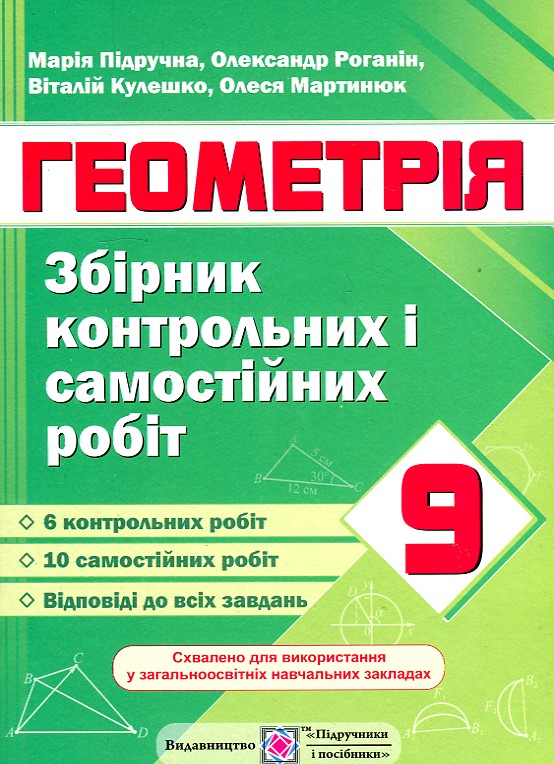 Посібник містить завдання для контрольних і самостійних робіт за всіма темами курсу геометрії 9 класу. Пропоновані роботи дають змогу здійснювати диференційований контроль навчальних досягнень школярів. Для вчителів математики та учнів закладів загальної середньої освіта.