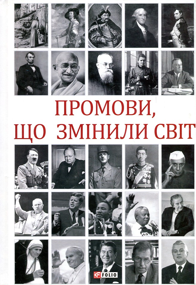 Історію творять видатні особистості. Але чи можуть слова змінити її хід? Звичайно, можуть, якщо вони були вимовлені великою людиною. Ця книга є зібранням публічних промов людей різних епох і народів — від найдавніших філософів до сучасних політиків, громадських і релігійних діячів. Мойсей, Франциск Ассізький, Богдан Хмельницький, Джордж Вашингтон, Наполеон Бонапарт, Михайло Грушевський, Вінстон Черчілль, Джон Кеннеді, Мартін Лютер Кінг, Мати Тереза… У виступах цих та інших найвидатніших персон можна знайти слова та думки, які не залишать нікого з читачів байдужими. З ними можна погоджуватися і сперечатися, але харизма кожного з ораторів і досі відчувається навіть зі сторінок книжки. Промови, що увійшли до видання, це не тільки шедеври ораторської майстерності, це віхи в історії людства, які є відправними точками подій, що змінили світ.