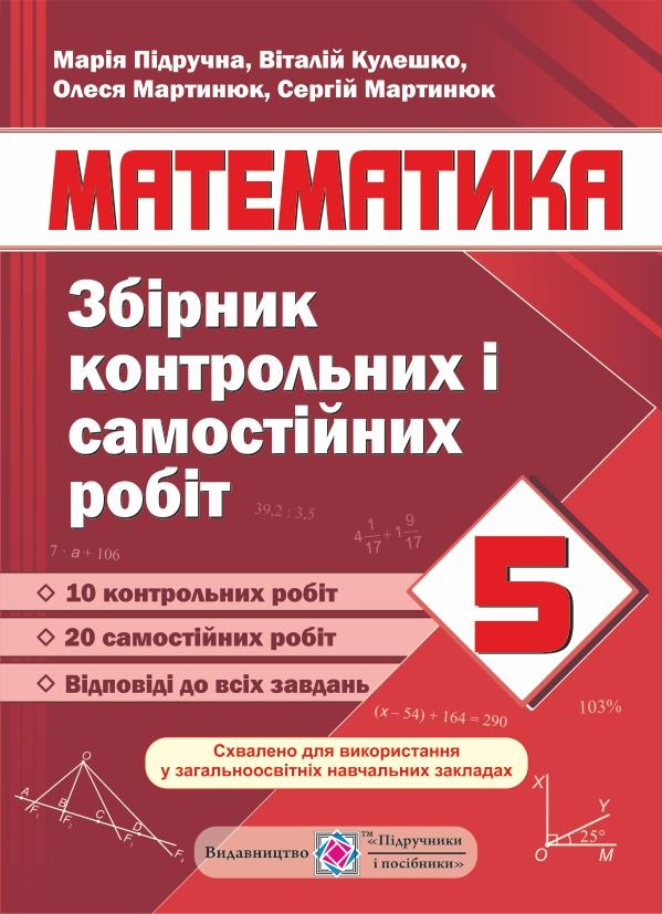 Посібник призначений для поточного і тематичного контролю навчальних досягнень учнів 5 класу закладів загальної середньої освіти й містить 10 контрольних і 20 самостійних робіт, які охоплюють усі теми курсу математики 5 класу. Він відповідає чинній програмі й підручникам з математики. Для вчителів математики та учнів 5 класу закладів загальної середньої освіти.