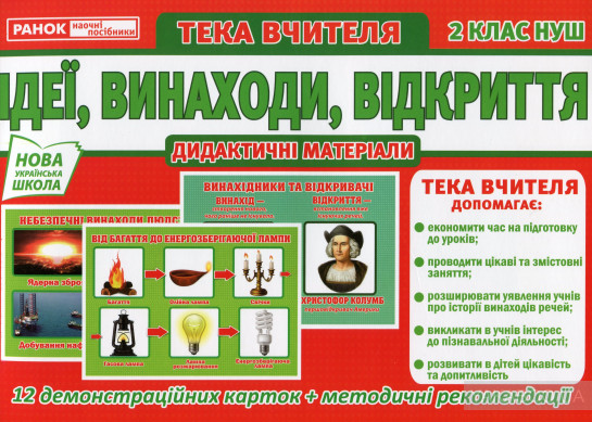 Дидактичний матеріал призначений для роботи з учнями 2 класу за програмою «Нова українська школа». Містить 12 демонстраційних карток з фотоілюстраціями. Методичні рекомендації зібрані в папці. Це зручно для використання та зберігання матеріалу під час занять і протягом року. Завдяки картками вчитель легко покаже різницю між винахідниками і відкривачами.