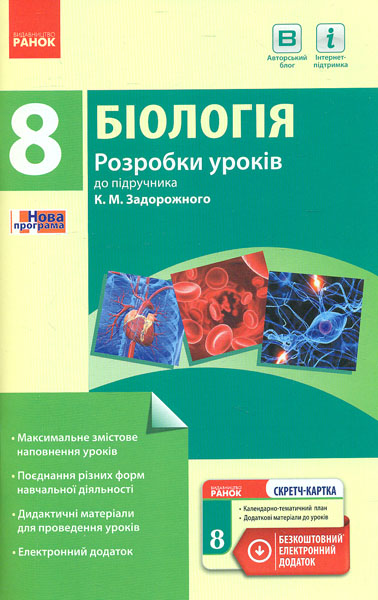 Посібник укладено відповідно до чинної програми з біології для 8 класів загальноосвітніх навчальних закладів. Посібник містить розробки всіх уроків з методичними рекомендаціями щодо форм, засобів і методів навчання. Посібник орієнтований на підручник «Біологія. 8 клас» автора К. Ш. Задорожного. Посібник має електронний додаток, в якому розміщено календарний план та додаткові матеріали до уроків у форматі Word. Посібник призначений для учителів біології та студентів педагогічних спеціальностей.