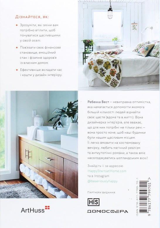 Що потрібно для щастя вдома? Ні, річ не в покупці нового дивану. Річ у тому, чи комфортно вам у власному домі. Приємний сон, здорові стосунки й хороше самопочуття — важливі складники щасливого життя та гарного настрою, і на це все безпосередньо впливає ваша домівка. Експертка з дизайну Ребекка Вест розповідає, як досягти цілющого ефекту новизни помешкання без фактичного переїзду та як зробити ремонт, щоб почуватися якнайкраще у своїй оселі. Завдяки цінним порадам у книжці «Щасливий дім» ви навчитеся розсудливо користуватися фінансами, станете більш відкритими до нових ідей і зможете створити дім, який викликатиме у вас лише радість та усмішку.