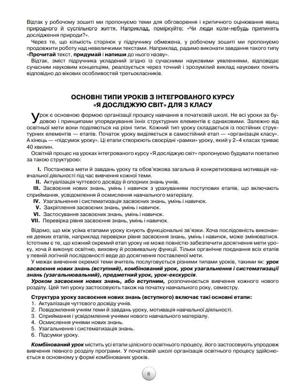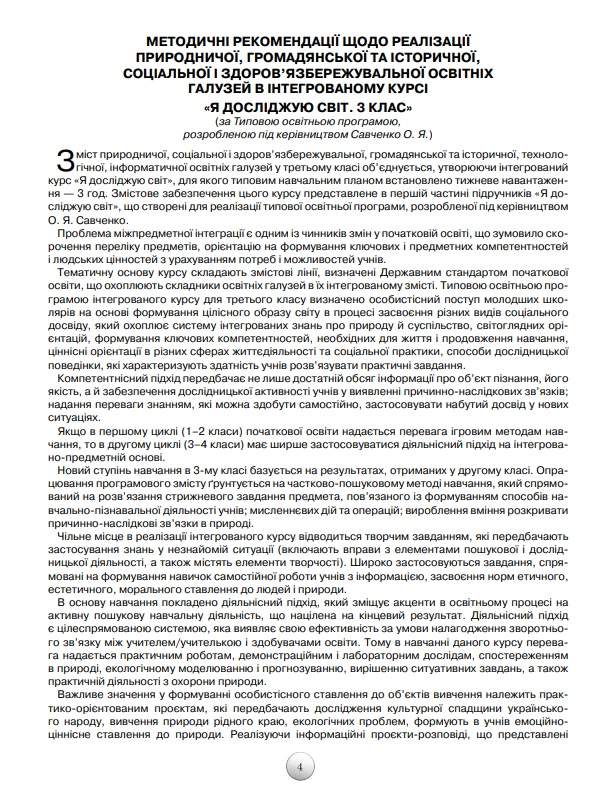 Посібник містить методичні рекомендації щодо реалізації природничої, громадянськоїта історичної, соціальної та здоров’язбережувальної освітніх галузей в інтегрованому курсі «Я досліджую світ» для 3 класу, орієнтовне календарно-тематичне планування з інтегрованого курсу й розгорнуті конспекти уроків, різнопланові методичній дидактичні матеріали до уроків інтегрованого курсу «Я досліджую світ».