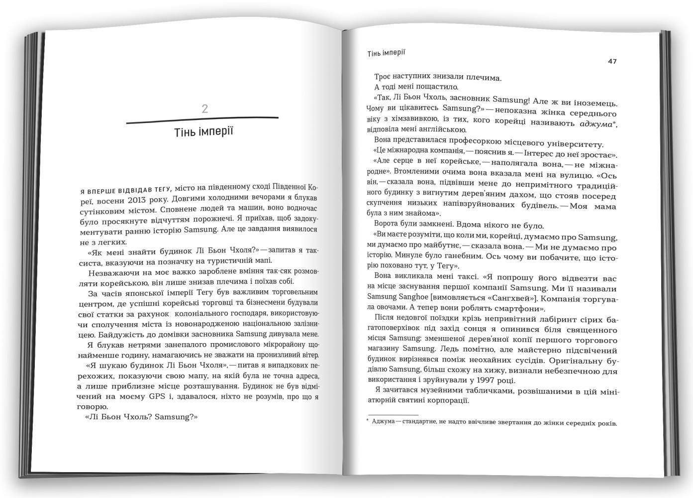 Спираючись на багаторічний досвід роботи південнокорейським кореспонден-том для видань The Economist, The Wall Street Journal і Time, а також на власні джерела всередині Samsung, Джефрі Кейн пропонує погляд за лаштунки однієї з найбільших і наймогутніших корпорацій світу.