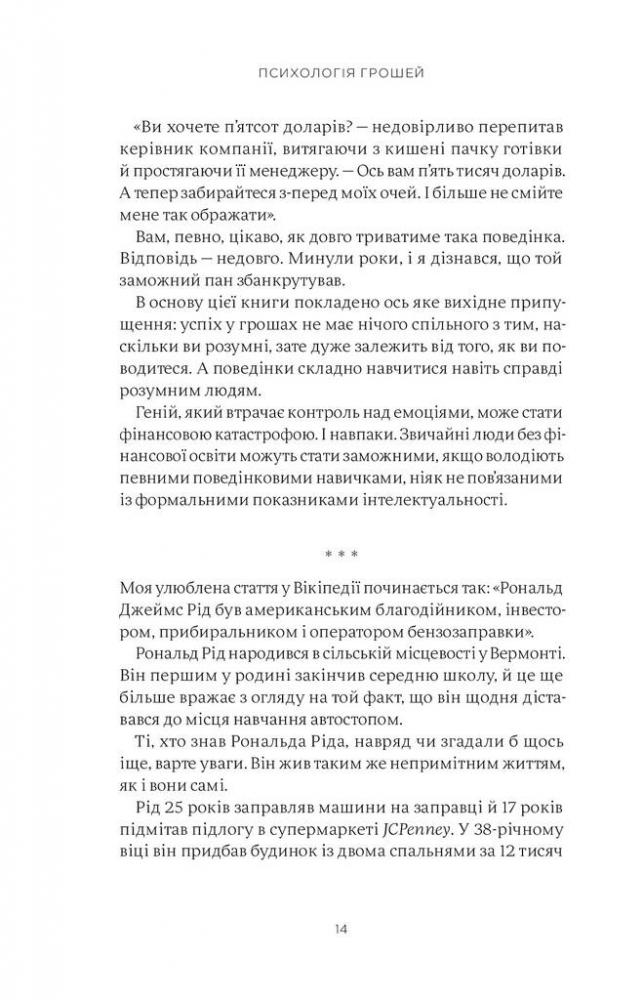 Ефективна взаємодія з грошима не обов’язково залежить від знань. Вона залежить від того, як ви поводитеся. А навчитися певної поведінки складно, навіть справді розумним людям. Інвестування грошей, особисті фінанси, рішення для бізнесу — усе це зазвичай вивчають як математичні дисципліни, де дані й формули точно підказують необхідні кроки. Та в реальному світі люди не ухвалюють фінансових рішень на основі електронних таблиць. Вони приймають такі рішення за обіднім столом чи в переговорній, де докупи змішуються особиста історія, унікальний світогляд, его, самолюбство, маркетинг і всілякі випадкові стимули. У книзі «Психологія грошей» знаний автор Морґан Гаусел розповідає дев’ятнадцять коротких історій про дивні способи сприйняття грошей і навчає, як краще осягнути цю тему, одну з найважливіших у житті.