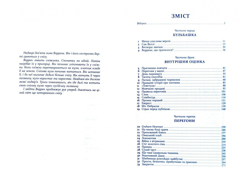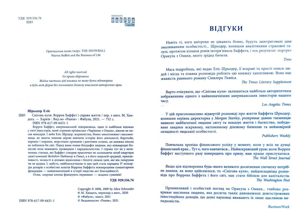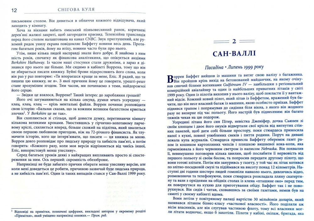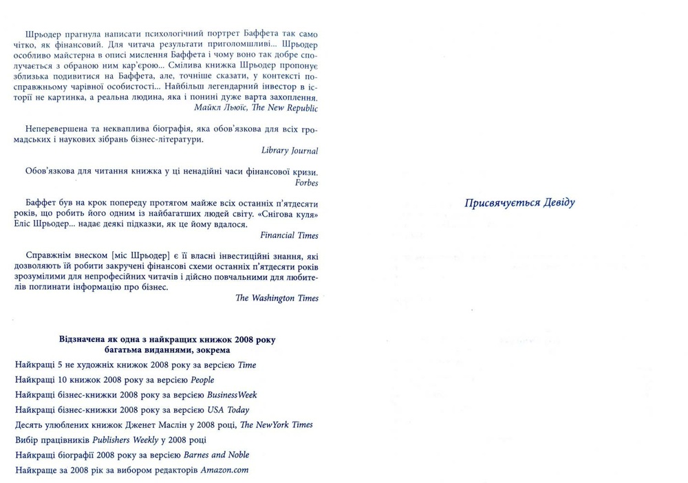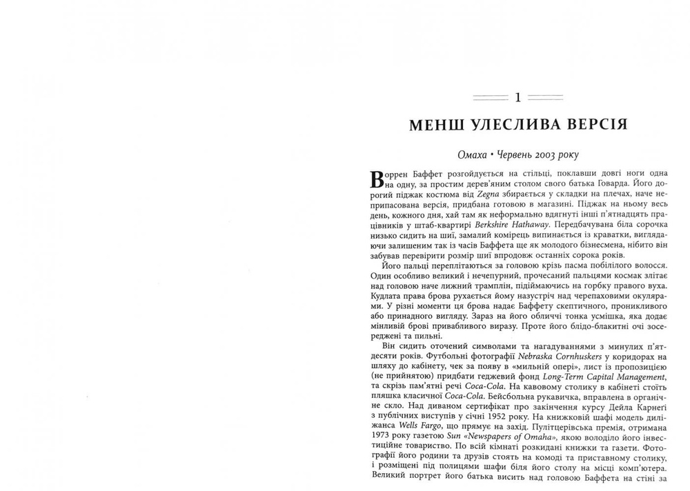Воррен Баффет, американський підприємець, один із найбільш відомих у світі інвесторів, який отримав прізвисько «Чарівник з Омахи», ніколи не писав мемуарів. І якби Еліс Шредер, журналістка, бізнес-аналітикиня і письменниця, не змогла повною мірою вивчити історію його діяльності, боротьби, перемог і поразок, жорстоких промахів і раптових осяянь, ця книжка ніколи не побачила би світ. Перед вами повна біографія людини, яку міжнародні бізнесові кола вважають провидцем і парадоксалістом. І справа тут не у величезних статках, які Баффет створив практично не залишаючи штаб-квартири своєї компанії Berkshire Hathaway в Омасі, а в його широкій ерудиції, принциповості, чесності в ділових відносинах і безлічі свіжих ідей, які він генерував чи не щодня. І, мабуть, найблискучішою із цих ідей стала передача 37 мільярдів доларів з особистих коштів Воррена Баффета міжнародним гуманітарним фундаціям — найвизначніший в історії людства акт благодійності.