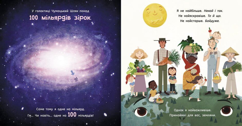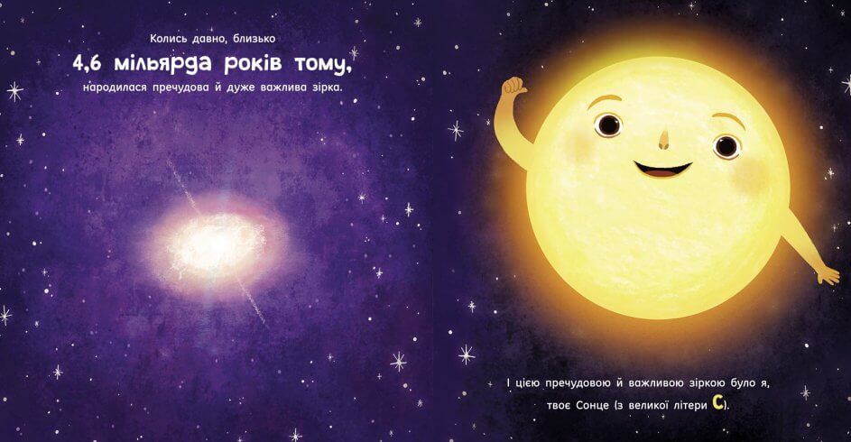 «Сонце: одне на мільярд» – це найкосмічніша книжка-картинка для дошколяриків. Тут власною персоною Сонце – справжня зірка в усіх значеннях цього слова – весело й легко розказує дітям цікаві факти про себе. Коли у Сонця день народження? І як довго воно ще сяятиме? Чому від нього фанатіють всі планети й до чого тут гравітація? Про все це маленькі земляни дізнаються на сторінках зіркової автобіографії.