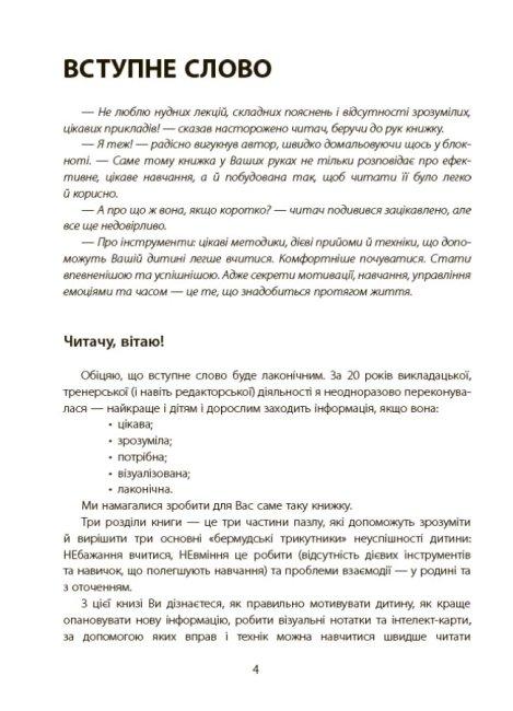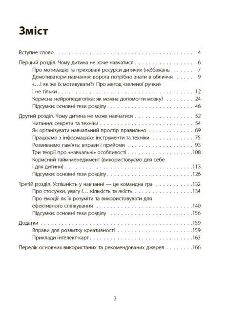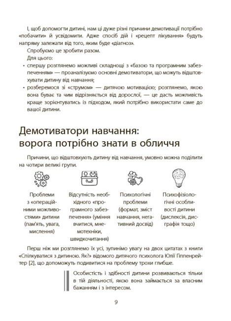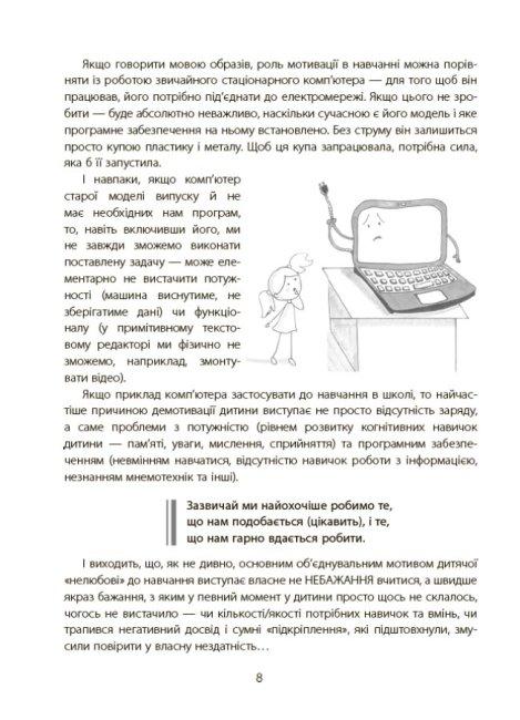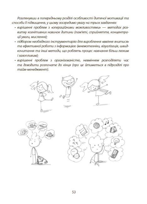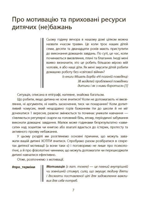Перед вами книжка, яка допоможе батькам учнів початкових класів визначити причини, що заважають дитині навчатися; з’ясувати, як правильно перезапустити дитячу мотивацію; зрозуміти, які підходи краще використати, щоб допомогти налагодити процес навчання, не впадаючи в крайнощі гіперопіки чи конфліктних протистоянь. Ця книжка містить чіткі техніки, які допоможуть дитині навчитися вчитися, з легкістю опановувати знання, покращити пам'ять, техніку читання тощо.Сльози, істерики, нервове напруження, інколи крики та навіть покарання. Всі ці слова давно стали синонімами найстрашнішій нічній примарі батьків — домашньому завданню. Ми пропонуємо знайти вихід з цієї ситуації раз і назавжди, та допомогти дитині навчитися отримувати задоволення від навчання.Ця книжка допоможе вам:- визначити причини, що заважають дитині навчатися;- з’ясувати, як правильно перезапустити дитячу мотивацію та «прокачати» когнітивні навички у молодшому шкільному віці;- зрозуміти, які підходи краще використати, щоб допомогти налагодити процес навчання і розвитку, не впадаючи у крайнощі гіперопіки чи конфліктних протистоянь.Ви і ваша дитина отримаєте цілий комплекс дієвих інструментів:- лайфхаки з підготовки домашніх завдань;- вправи для розвитку пам’яті та уваги;- прийоми дитячого тайм-менеджменту;- корисності нейропедагогіки тощо. А найголовніше — всі ці техніки та вправи допоможуть вашій дитині навчити вчитися, легше опановувати різні за складністю обсяги знань, запам’ятовувати, засвоювати та використовувати інформацію. А це ті навички, які необхідні кожному протягом усього життя.