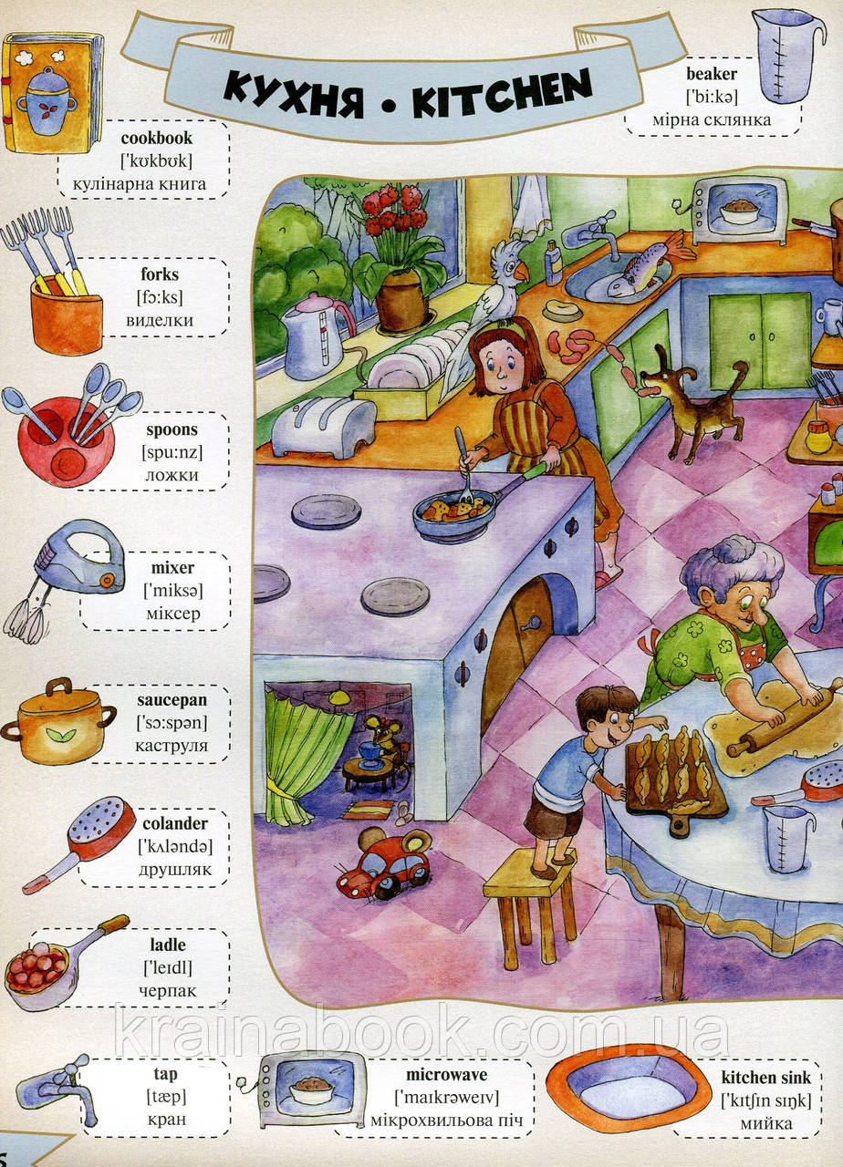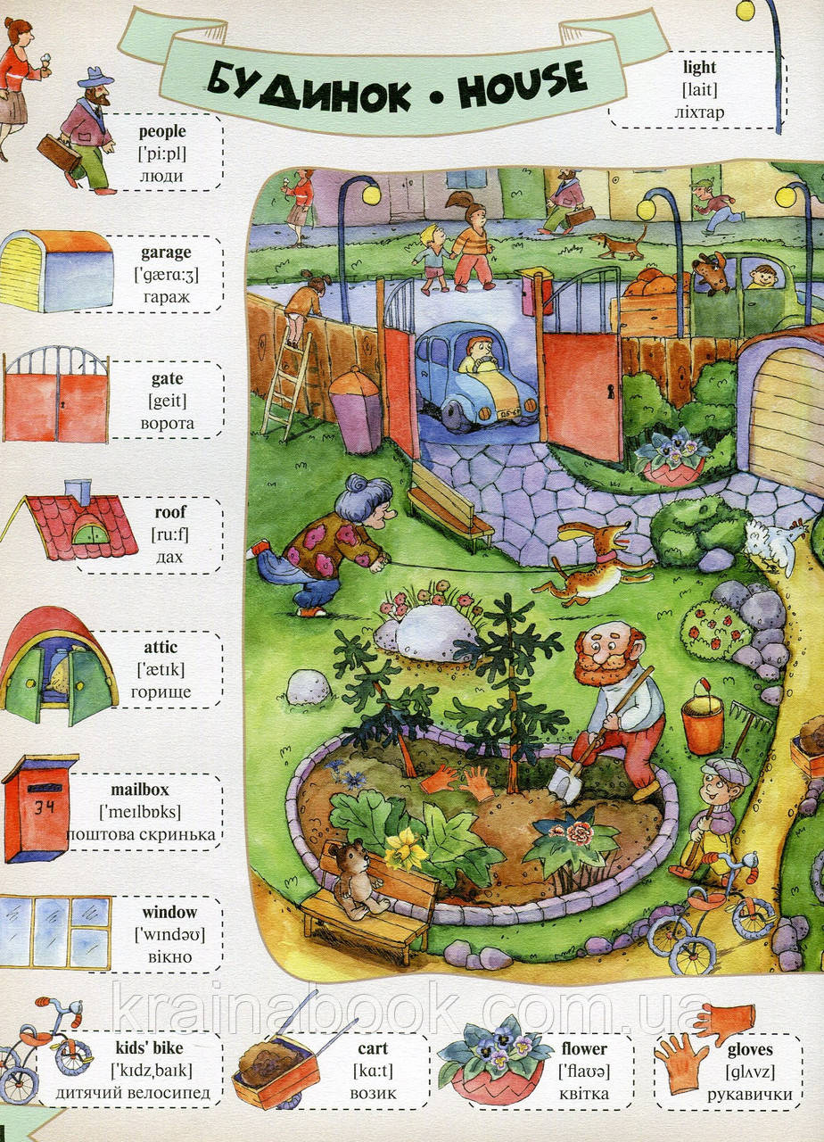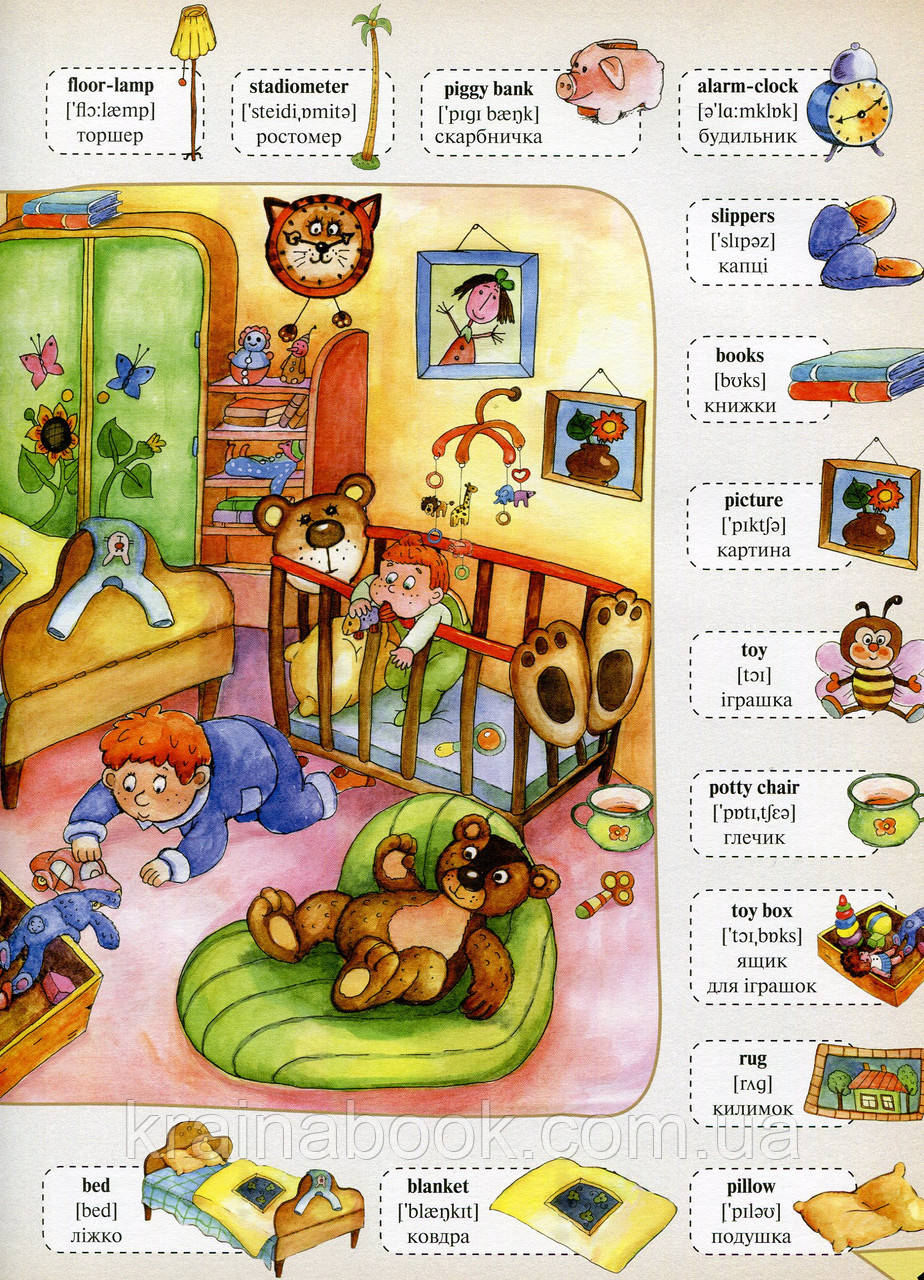 Ця чудова книжка містить 1000 англійських слів, які допоможуть малятам розширити словниковий запас і навчитися називати предмети, що їх оточують, англійською. Прекрасні ілюстрації зроблять навчання веселим і ненудним, транскрипції допоможуть з правильною вимовою, тематичні питання розвинуть логічне мислення, а кумедні вірші — пам’ять, фантазію і уяву.