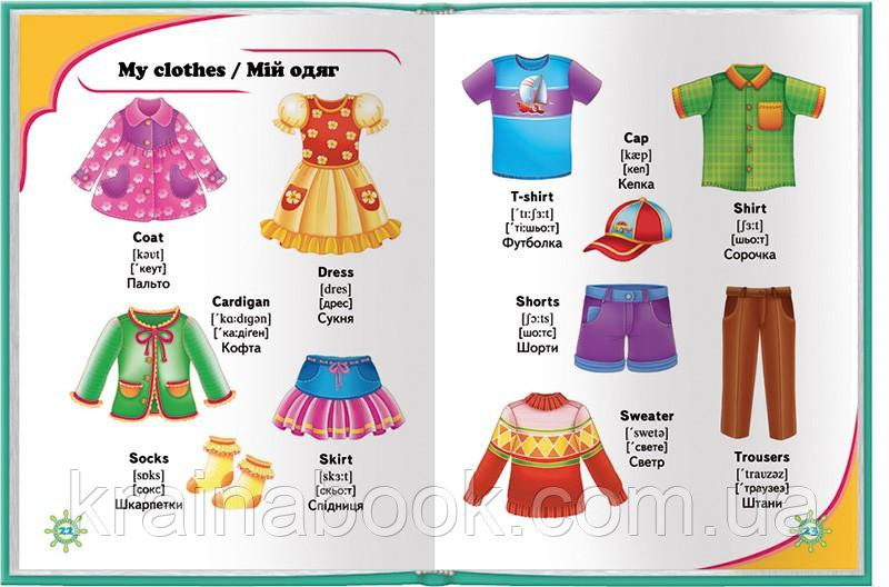 При цьому кожне поняття супроводжується кольоровою світлиною або малюнком, а також танскрипцією українською мовою. Тому прочитати його буде не складно!