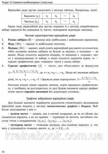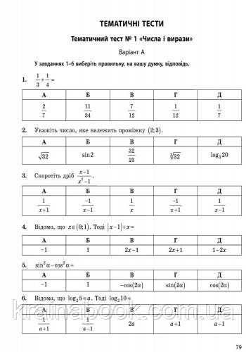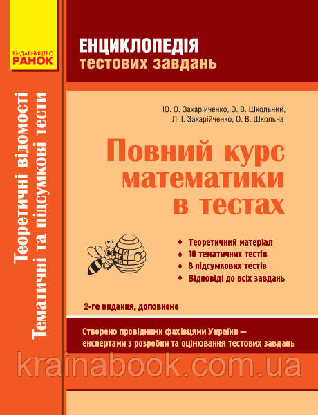 Видання містить короткі теоретичні відомості, тематичні й підсумкові комбіновані тести, структура яких відповідає структурі тестів ЗНО з математики. Матеріал посібника подано за тематичними блоками, які відтворюють змістові лінії сучасного шкільного курсу математики (5–11 класи). До всіх завдань наведено відповіді, до найбільш типових завдань, а також тих, що мають додаткове методичне навантаження, подано повні розв’язання з коментарями. Посібник є складовою навчально-методичного комплекту «Повний курс математики в тестах» серії «Енциклопедія тестових завдань». Призначено для учнів закладів загальної середньої освіти, абітурієнтів і тих, хто хоче систематизувати й повторити матеріал шкільного курсу математики; вчителів математики.