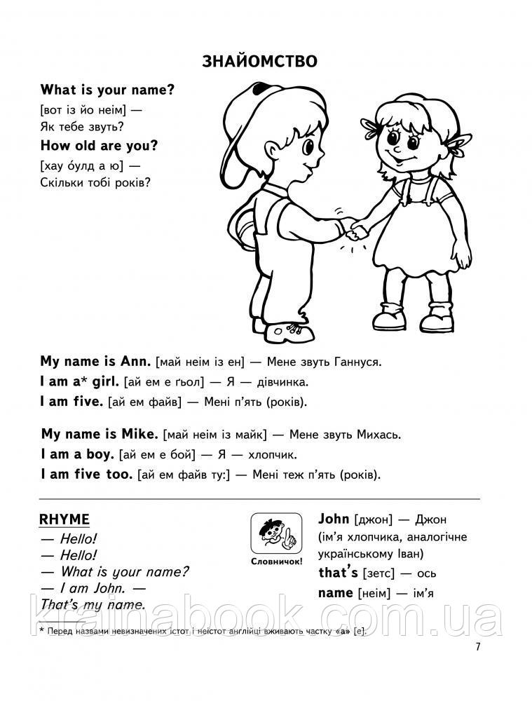Мета цієї книги — у доступній та цікавій формі ознайомити дитину з першими англійськими словами і сталими виразами. У посібнику наведено теми з розвитку усного мовлення дитини, що починає вивчати англійську. Тут ви знайдете також навчальні ігрові завдання, виконуючи які дитина запам’ятає фрази і слова, здобуде перші навички спілкування англійською.