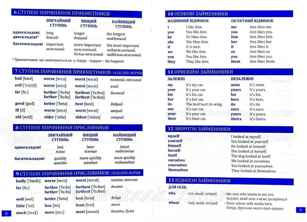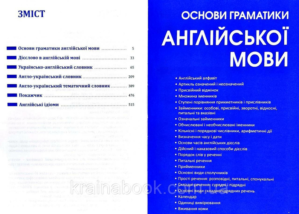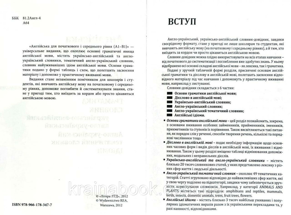 «Англійська для початкового і середнього рівня (A1-B1)» — універсальне видання, що охоплює основні граматичні явища англійської мови, містить українсько-англійський та англо-український словники, тематичний англо-український словник, словник найуживаніших ідіом англійської мови. Основи граматики подано у формі таблиць і схем, що полегшить засвоєння матеріалу і допоможе у практичному вживанні мови. Видання стане незамінним помічником для школярів і студентів, які вивчають англійську мову на початковому і середньому рівнях, допоможе поглибити й систематизувати знання, стане у пригоді тим, хто виїздить за кордон або просто цікавиться англійською мовою.
