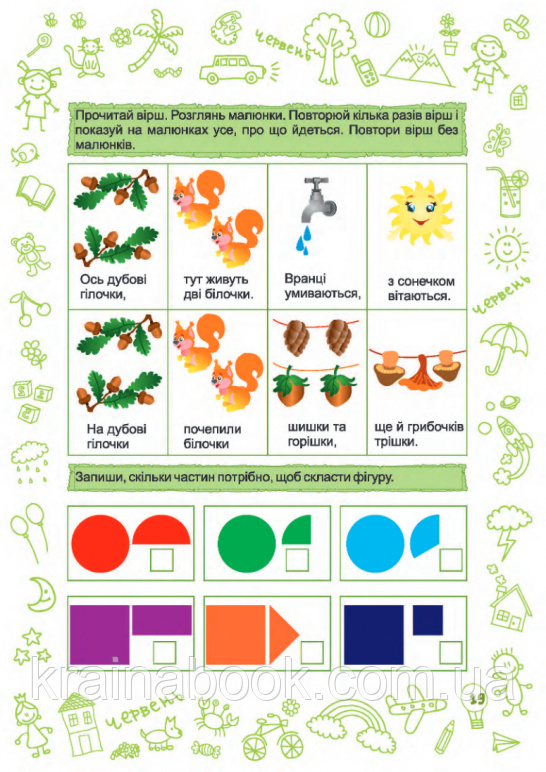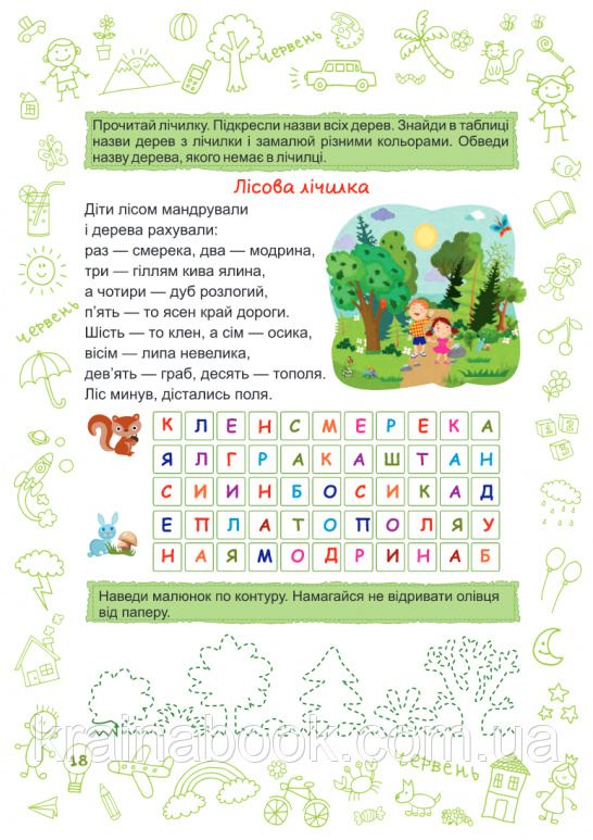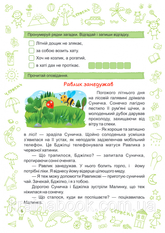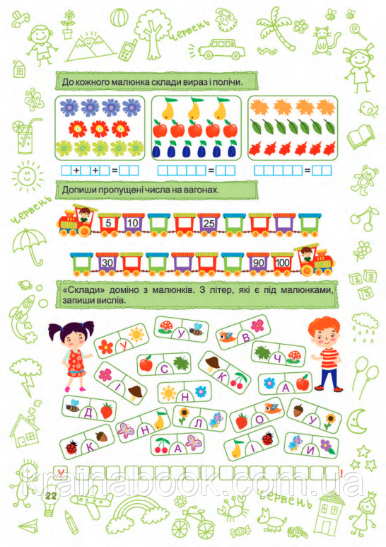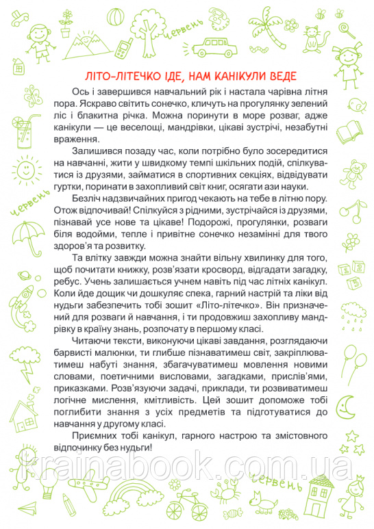 Зошит запрошує школярів продовжити захопливу мандрівку у світ знань, розпочату в першому класі. Кілька хвилин щоденного виконання завдань зошита забезпечать повторення вивченого матеріалу та якісну підготовку до навчання у другому класі.