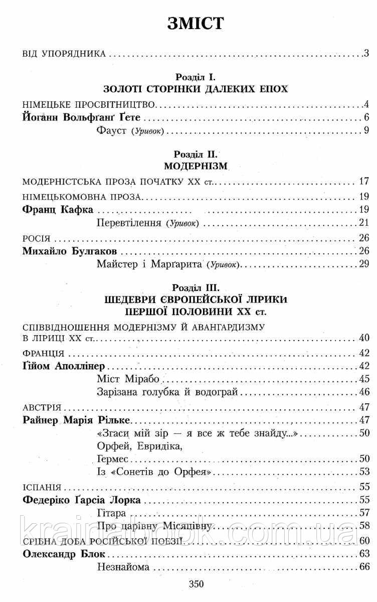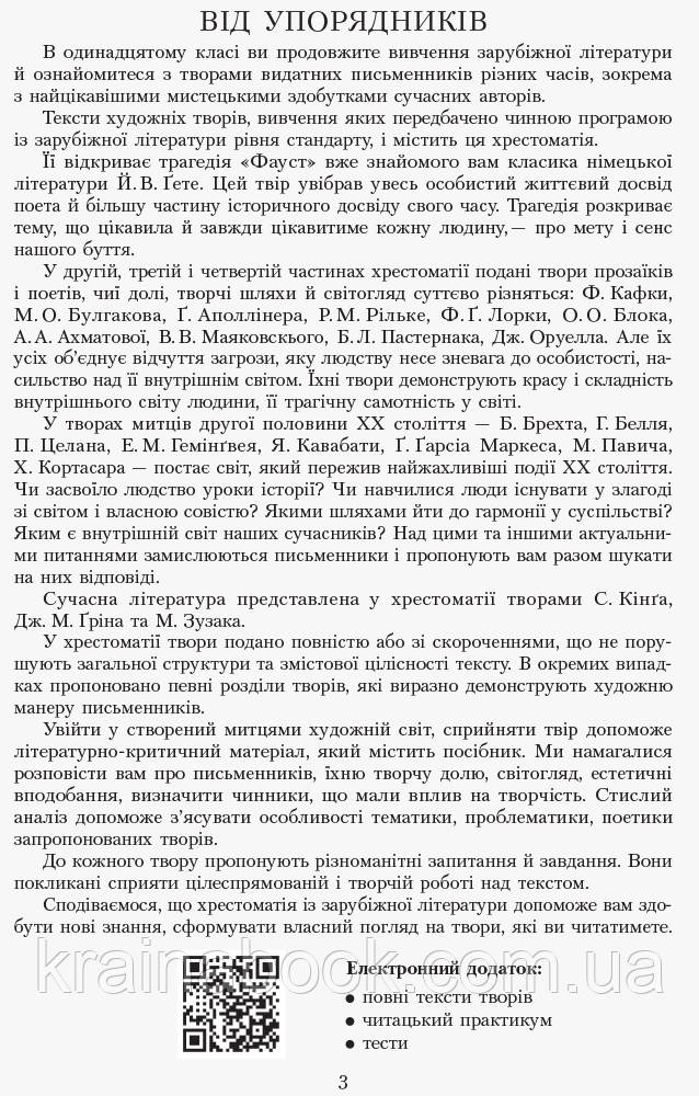 Хрестоматія відповідає чинним програмам із зарубіжної літератури. Оглядові статті допоможуть уявити загальну картину мистецького життя певної епохи. Розповіді про письменників, їхні життєві та творчі шляхи, естетичні пошуки покликані підготувати учнів до сприйняття художніх творів. Питання, завдання зосереджують увагу на ключових фрагментах твору, окремих образах, деталях, особливостях стилю письменника, допомагають усвідомити значущість художнього явища. Посібник призначений для учнів 11 класів закладів загальної середньої освіти.