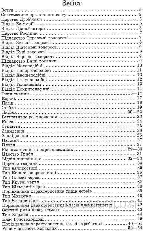 Посібник має чотири розділи: ботаніка, зоологія, біологія людини, загальна біологія.