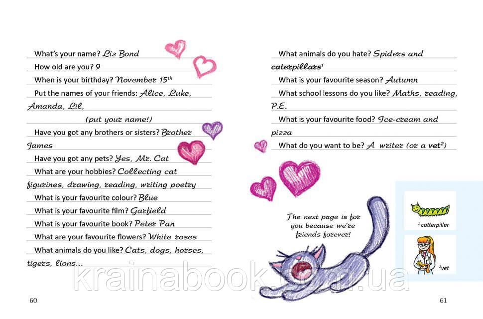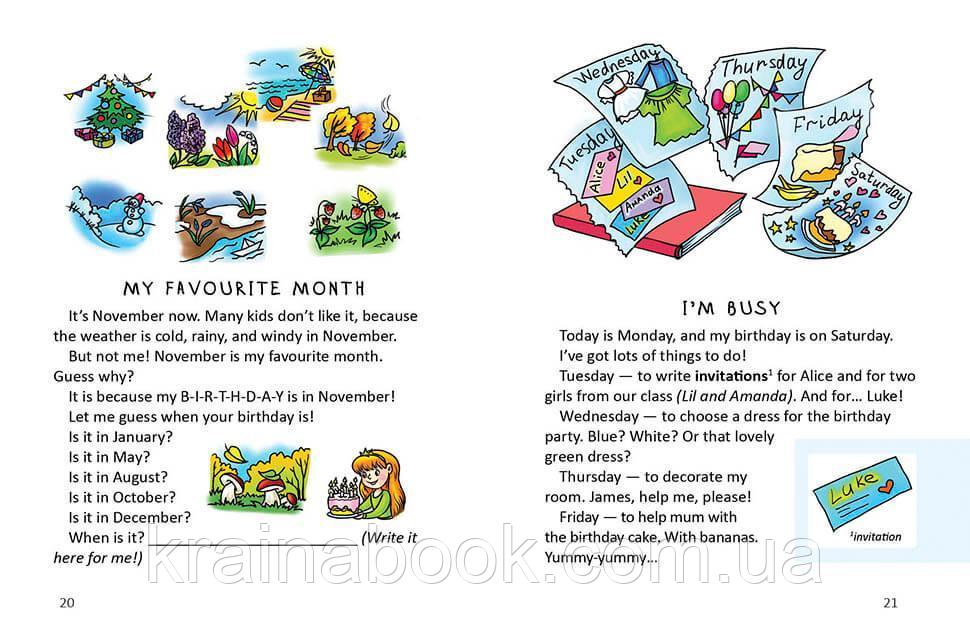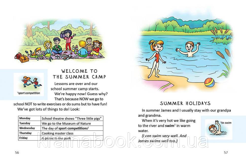 Цю книжку адресовано дітям, які вже навчилися читати англійською та мають наміри закріпити свої знання. Автор книги — кандидат філологічних наук, доцент кафедри теорії та практики англійської мови Гончарова Ольга Анатоліївна. У цій книзі діти прочитають про цікаву й веселу дівчинку Лізу, ії дружну родину, дотепних і надійних друзів та улюбленого котика. Маленькі читачі із задоволенням опановуватимуть англійську, бо конче захочуть дізнатися про те, як діти спілкуються у школі та під час канікул, на уроках і на вечірці, вдома та в літньому таборі, з батьками і друзями. Бо ж Ліза така чуйна, невгамовна й винахідлива...За унікальною авторською методикою нові англійські слова пояснюються самими малюнками, без перекладу.