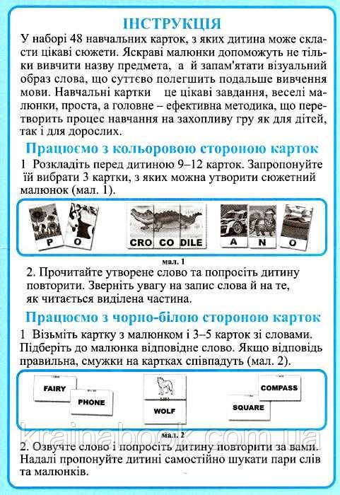 Набір карток з малюнками - 48 карток, з яких можна скласти 16 слів. Використання усіх карток серії сприятиме кращому запам'ятовуванню букв, вмінню їх розрізняти, читати слова, складати речення і розуміти зміст прочитаного.