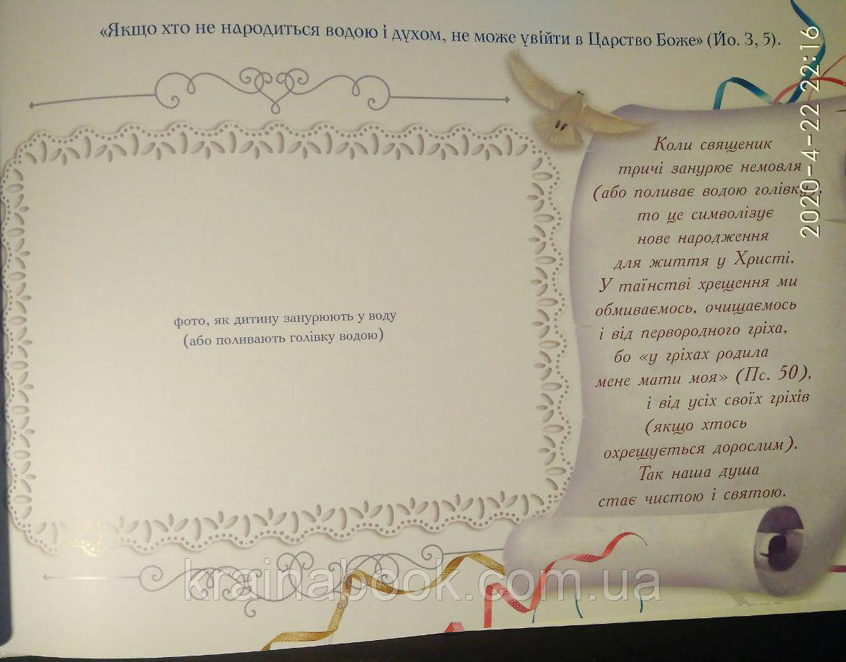 Альбом-пам`ятка для ваших діток в день хрещення. Допоможе батькам зафіксувати перше Таїнство дитинки, всі важливі дані, перші світлини малюка і зігріватиме вечорами, коли дитинка уже підросте