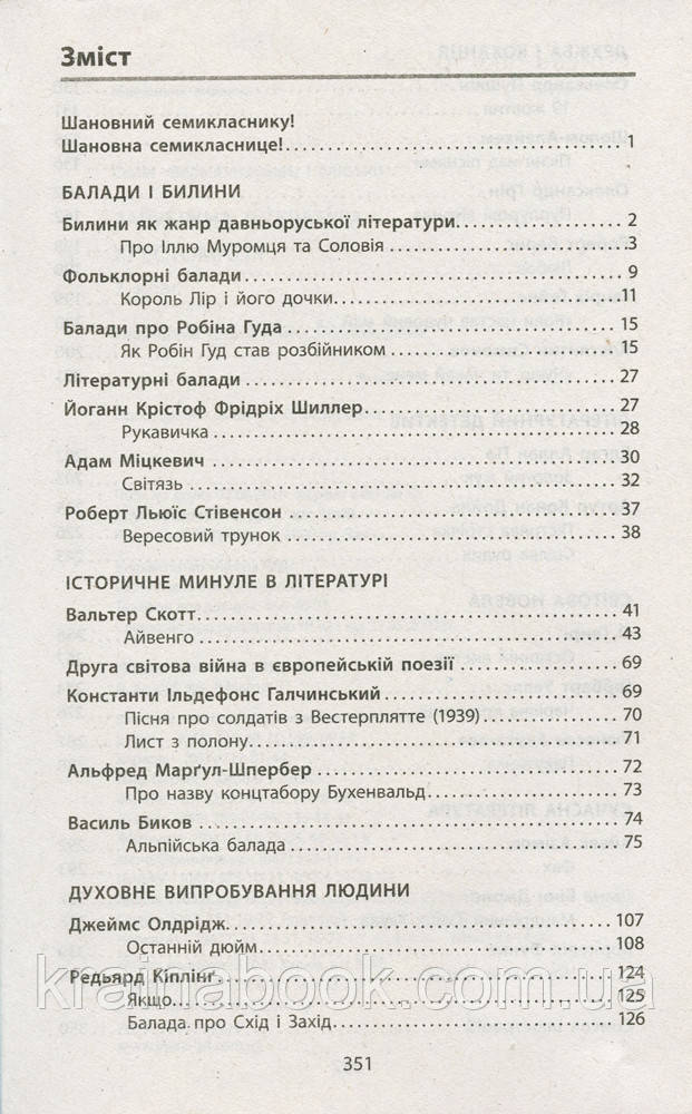 Хрестоматія містить твори, вивчення яких у 7 класі передбачене чинною програмою "Зарубіжна література. 5-9 класи (2012 р. зі змінами 2015-2017 рр.)", і структурована за розділами "Балади і билини", "Історичне минуле в літературі", "Духовне випробування людини", "Дружба і кохання", "Літературний детектив", "Світова новела", "Сучасна література". Твори, запропоновані у хрестоматії, мають методичний супровід: подаються короткі відомості про авторів, завдання і запитання, які скеровують увагу читача на важливі епізоди, особливості представлених художніх текстів. До хрестоматії додається "Щоденник читача". Цей посібник містить цікаві завдання, які допоможуть навчитися читати вдумливо, давати зважені оцінки прочитаному.