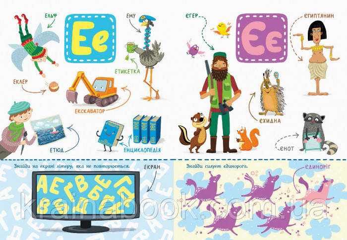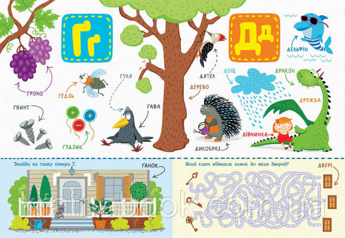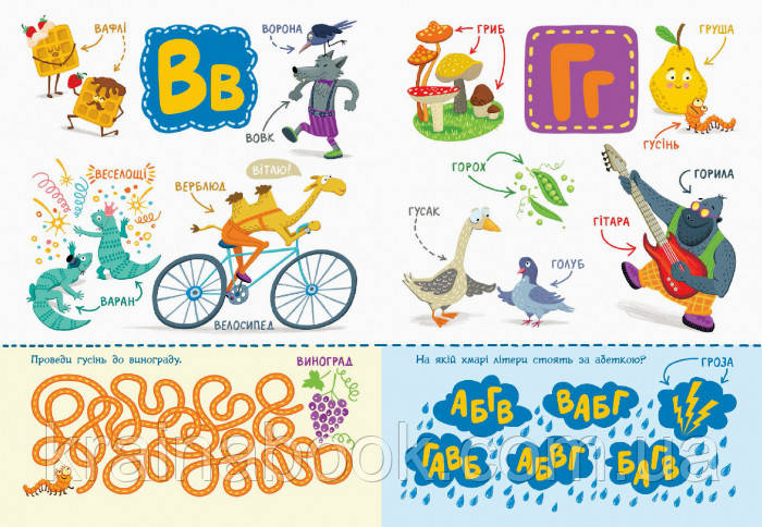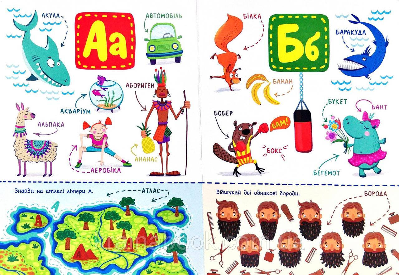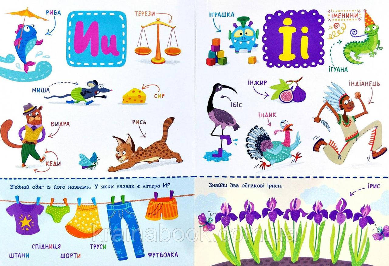 Книга познайомить малюка з абеткою та допоможе зробити перші кроки у читанні. На кожній сторінці багато предметів на певну літеру, а також завдання для кращого засвоєння абетки.