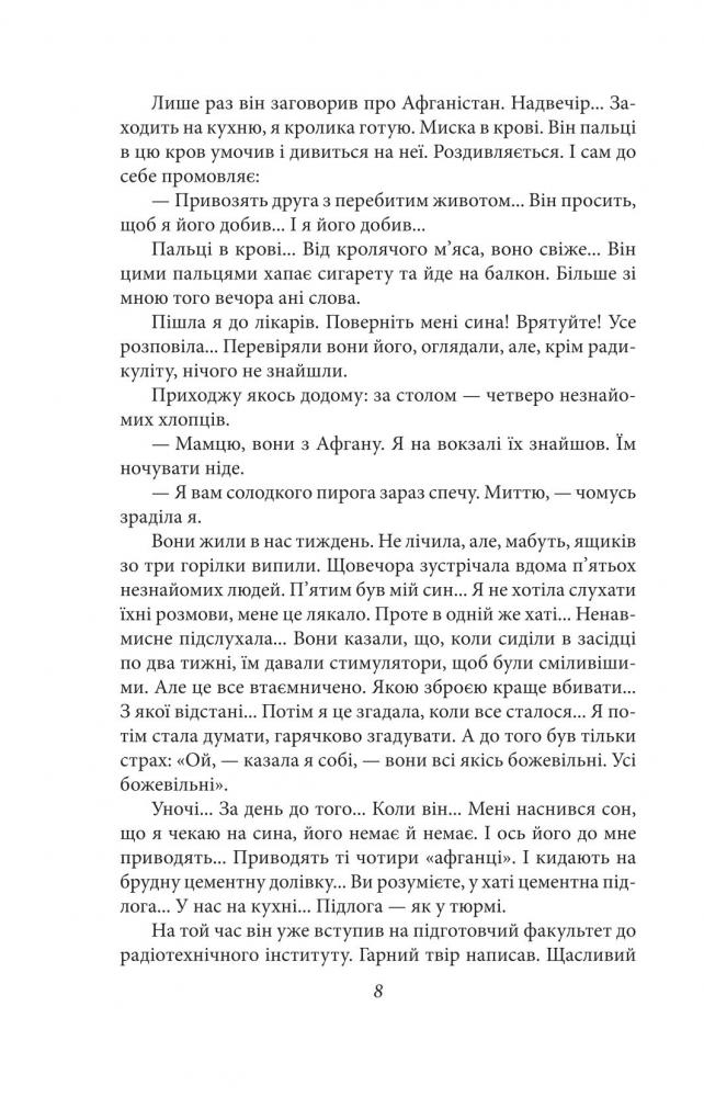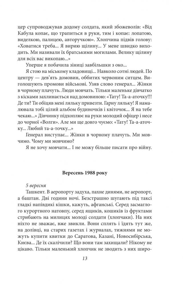 Книжка Світлани Алексієвич «Цинкові хлопчики» присвячена війні в Афганістані, коли десять років — з 1979-го і до 1989-го на чужій землі гинули наші радянські військові. Правда про ту війну ретельно приховувалася: держава через засоби масової інформації розвернула пропаганду необхідності та успішності «надання міжнародної фінансової допомоги дружньому народові Афганістану». В результаті Афганська війна для обивателя довгий час залишалася невідомою, зовні гладкою, а головне — майже безкровною. Газети публікували статті про успішні військові операції радянських військ в Афганістані, де майже не було жертв серед нашого контингенту, а втрати противника, навпаки, значно перевищувались... Але все частіше стали привозити додому в домовинах, оббитих цинковою бляхою, загиблих хлопців, які нещодавно закінчили школу... Заглядати всередину труни не дозволялося, похорон не афішувався, і рідним навіть не повідомляли справжню причину смерті їхніх дітей... А хто повертався живим —той не міг знайти себе у мирному житті. Цієї війни наче не було. Були лише скалічені та мертві хлопчики... І не тільки тілом, але й душею.