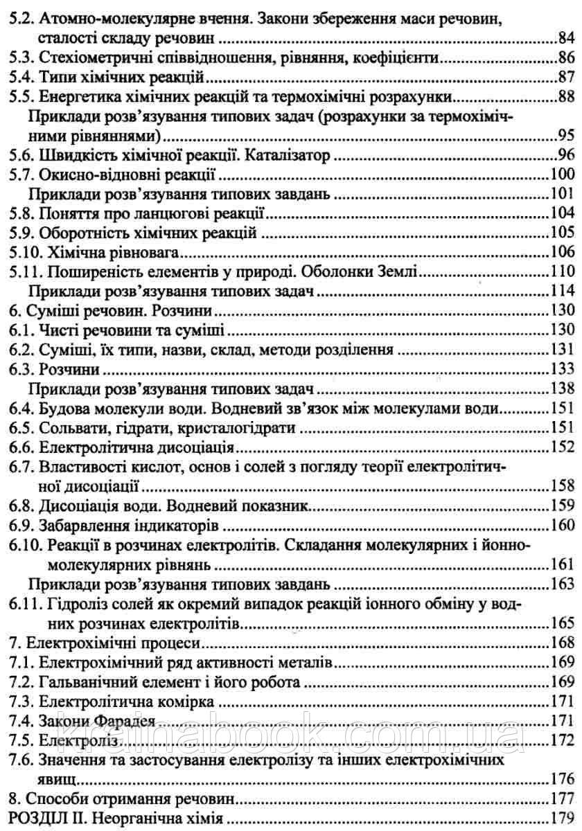 Довідкове видання охоплює матеріал загальної, неорганічної та органічної хімії в рамках шкільної програми і програми ЗНО. У розділі I «Загальна хімія» подано загально-теоретичні основи хімії: основні поняття і закони, будова атома, хімічний зв’язок, хімічна реакція, Періодичний закон і періодична система хімічних елементів Д. І. Менделєєва, електролітична дисоціація, окисно-відновні реакції. У розділі II «Неорганічна хімія» розглянуто основні класи неорганічних хімічних сполук, подано відомості про найважливіші металічні та неметалічні елементи, їх сполуки (описано хімічні властивості, лабораторні та промислові способи добування, застосування). Розділ III «Органічна хімія» містить дані про будову, склад, номенклатуру, властивості основних класів органічних сполук, розглянуто синтетичні високомолекулярні речовини і полімерні матеріали на їх основі, показано генетичні зв’язки між класами органічних сполук.  Назви хімічних елементів, простих речовин та сполук подано за номенклатурою IUPAC . Збірник задач є корисним не лише для учнів загальноосвітніх навчальних закладів, але й для абітурієнтів, які готуються до ЗНО з хімії.