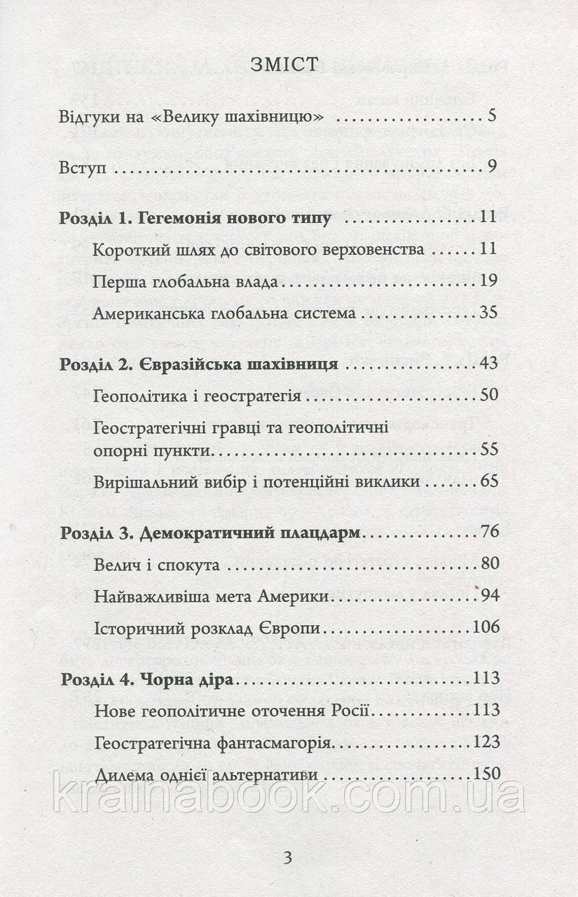 «Велика шахівниця» — одна з найбільш резонансних книжок кінця ХХ ст., яка й дотепер притягує інтерес читацької аудиторії. Куди рухаються у своїй міжнародній політиці найбільші держави світу? Якою може бути доля планети за того чи іншого перебігу подій? Такі питання ставив перед собою видатний американський політолог, і його відповіді на них вражають глибиною та проникливістю і збурюють дискусії та емоції. Бжезінського вивчають, його концепцію детально аналізують; одні захоплюються її довершеністю, інші демонізують і автора, і його твір. Читачі цього видання складуть власне уявлення про глибину і слушність міркувань політолога, що постають перед нами в компетентному українському перекладі. І, звісно, слід пам’ятати, що в концепції Бжезінського і, відповідно, в цій книжці вагоме місце належить Україні, тому що нам випало жити в одному з «геополітичних опорних пунктів» світу.