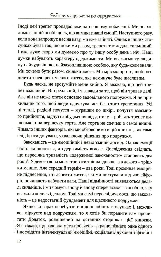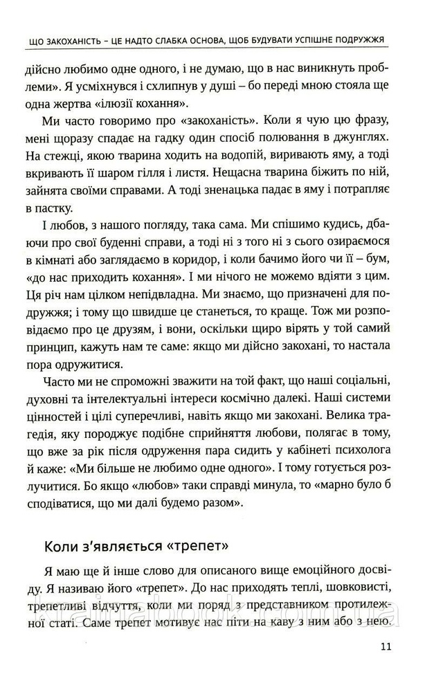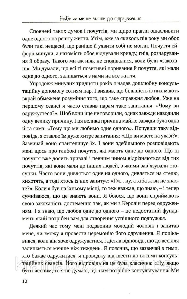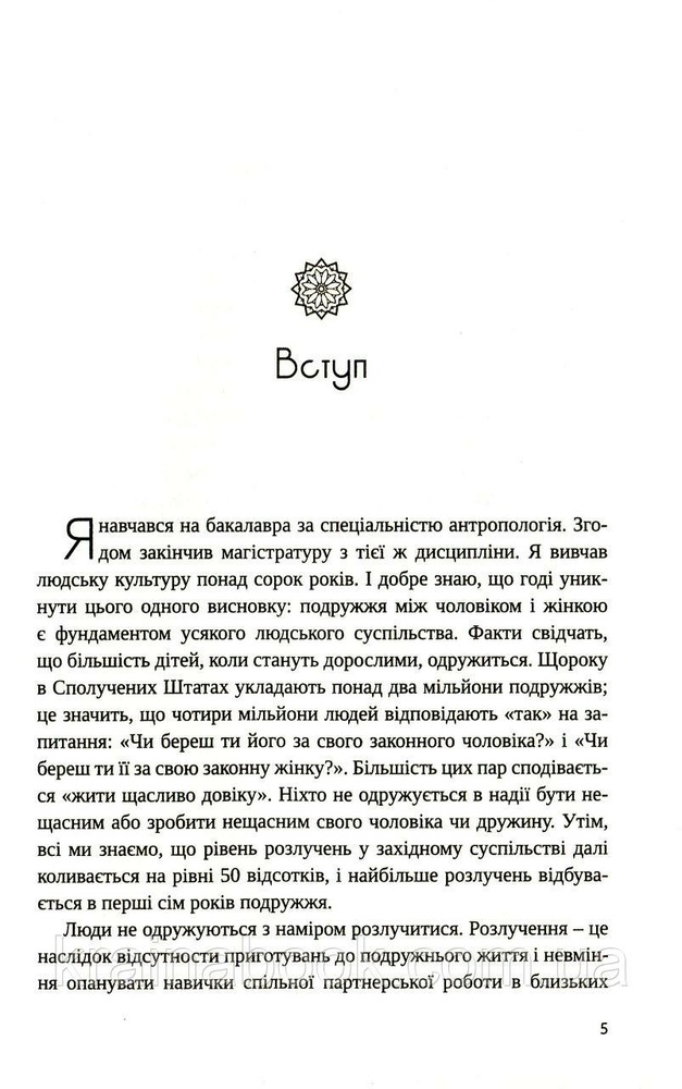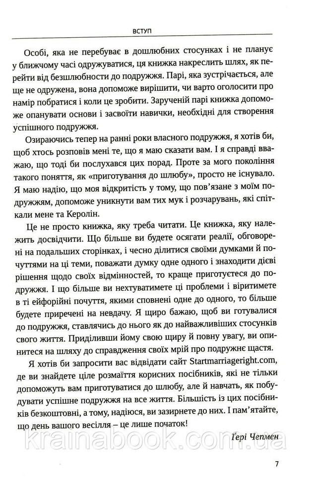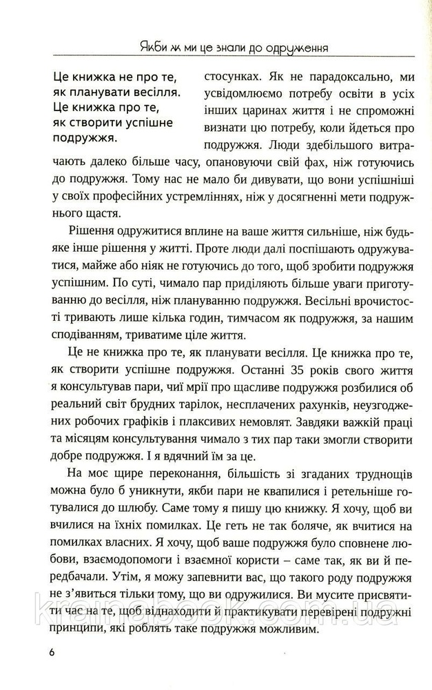 Перше, що тобі потрібно знати, дорогий читачу, — ця книжка не про те, як планувати весілля. Ця книжка про те, як створити успішне подружжя. Люди не одружуються з наміром розлучитися. Розлучення — це наслідок відсутності приготування до подружнього життя і невміння спільно працювати над стосунками. Ми часто зустрічаємо успішних людей, які зробили блискучу кар'єру у бізнесі, але у досягненні мети подружнього щастя зазнали краху.