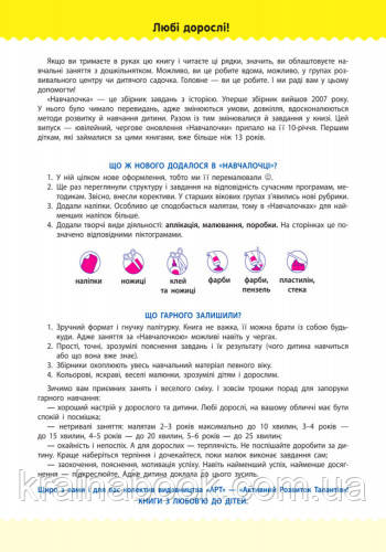 «Навчалочка» — оновлене ювілейне видання! Книги підходять для занять із дошкільником. Найкращі традиції «Навчалочки»: 1. Увесь навчальний матеріал певного віку, який підібрано з урахуванням розвитку дошкільників. 2. Зрозумілі та точні пояснення. 3. 100% результату після виконання завдань. 4. Кольорові малюнки та кумедні наліпки. 5. Зручний формат і гнучка палітурка. У збірниках нове оформлення! А також додано творчі види діяльності: (аплікація, малювання, саморобки).