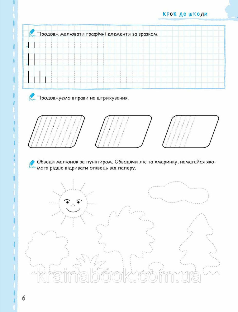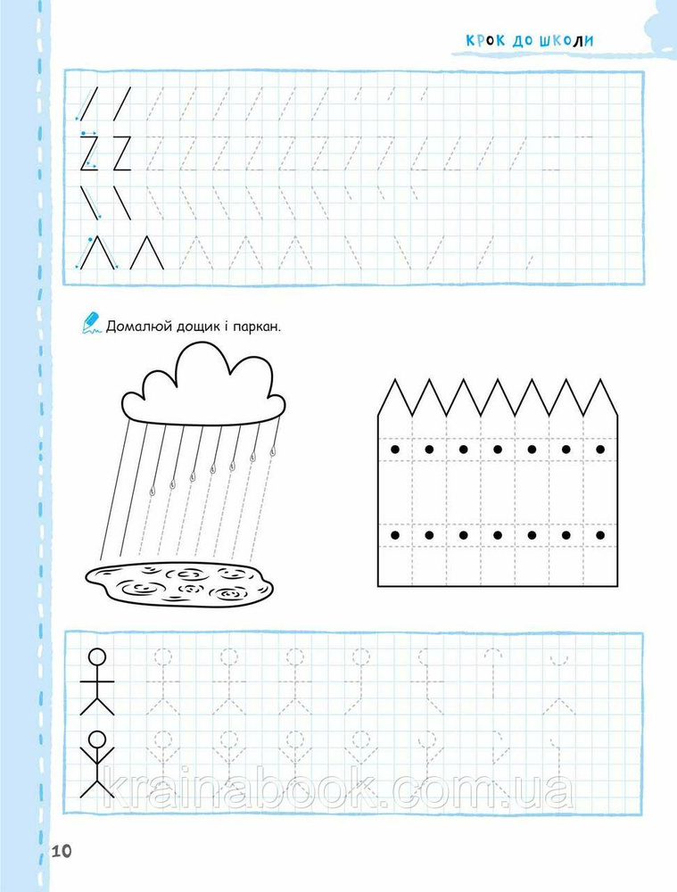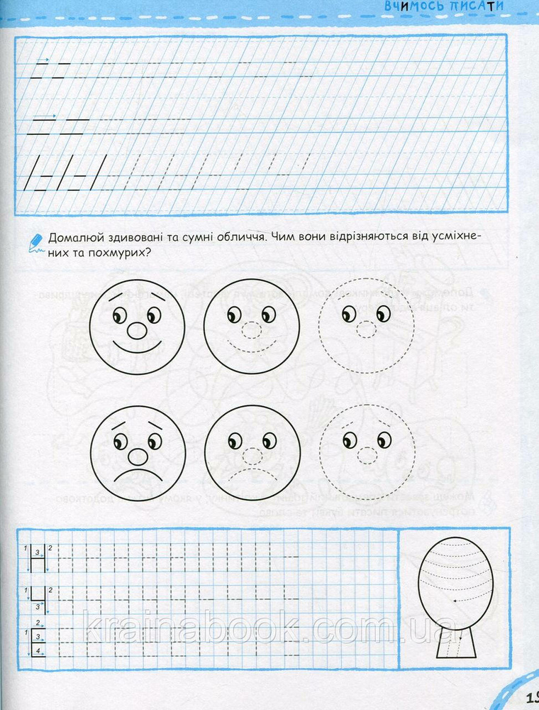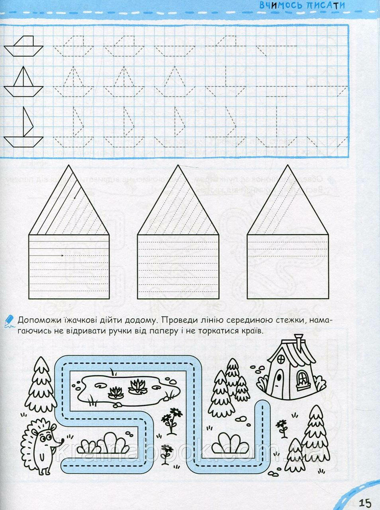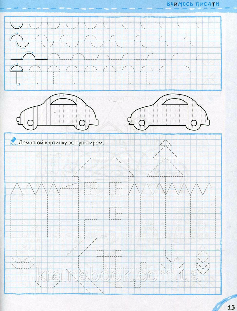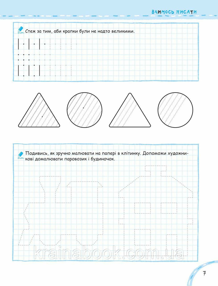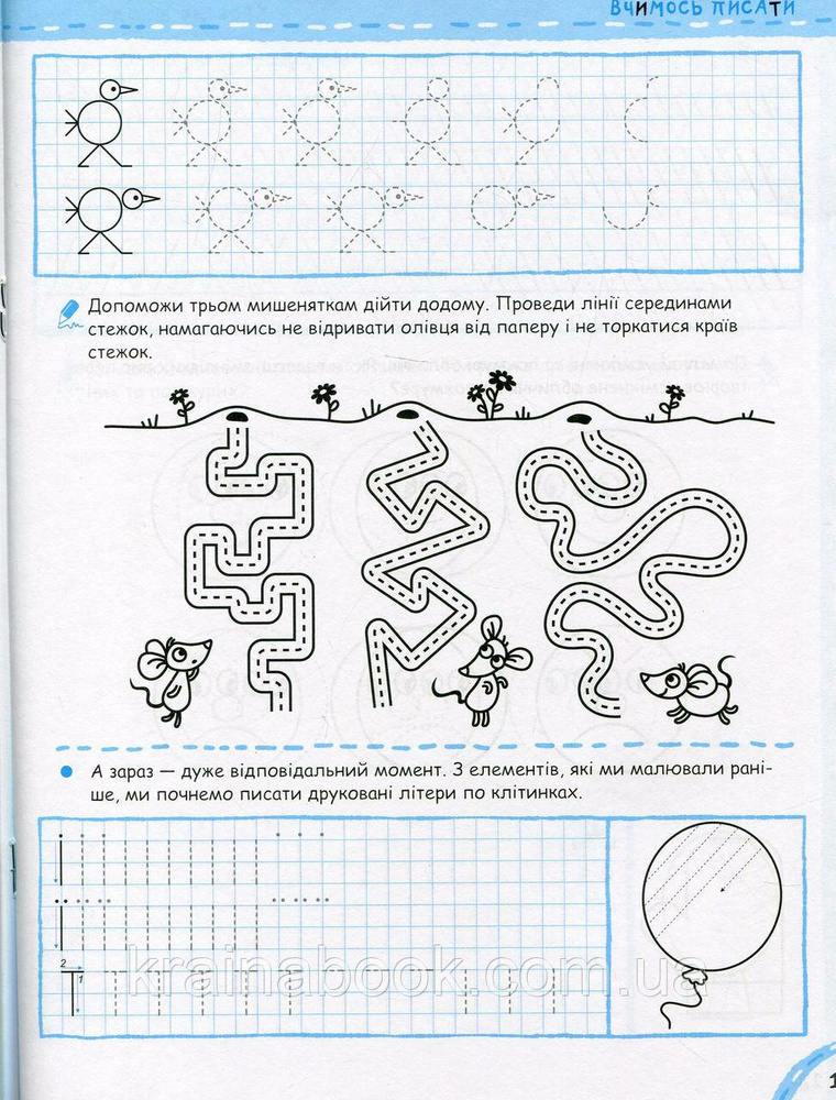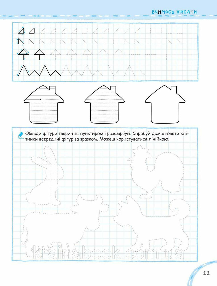 У нашому зошиті малюкові пропонується комплекс вправ на побудову різних графічних елементів, обведення фігур по клітинках і за пунктиром, штрихування, розфарбовування тощо. Посібник також містить вправи на написання великих друкованих літер по клітинках на основі засвоєних раніше графічних елементів.