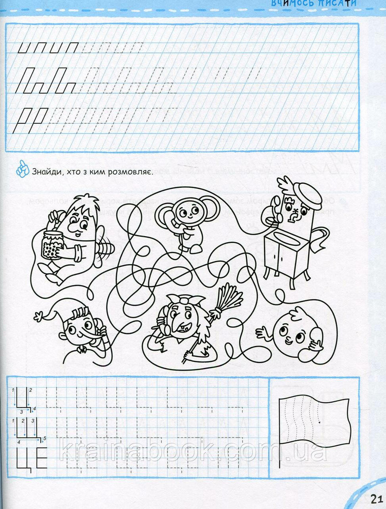 Ваш малюк побачить, що писати букви — просто. Будьте певні, незабаром дитина напише своє перше речення, нехай спочатку на папері в клітинку. Також на спеціальному запатентованому допоміжному шаблоні дитина почне писати елементи прописних букв. Фактично це перші прописи вашої дитини. Засвоївши їх, вона легко перейде до написання букв у школі, упізнаючи в них уже знайомі елементи.