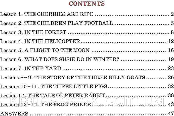 Книга містить казки, оповідання, адаптовані тексти для формування навичок читання на початковому рівні. Вправи дадуть учням змогу не лише засвоїти граматичні явища англійської мови, а й розвинути творчі здібності. Книга яскраво ілюстрована, містить вірші, загадки, кросворди, прислів’я, зміст яких пов'язаний з тематикою текстів.    Для учнів 4 класу загальноосвітніх середніх шкіл та вчителів англійської мови.