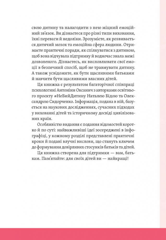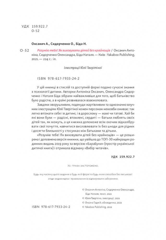 У цій книжці в стислій та доступній формі подано сучасні знання з психології дитини. Авторки Антоніна Оксанич, Наталя Біда і Олександра Сидорченко зібрали найважливіше для того, щоб батьківство було радістю, а в країні розвивалася взаємоповага. Завдяки зворушливим, подекуди жартівливим та однозначно влучним ілюстраціям Юлії Тверітіної кожен персонаж немовби оживає: так легко впізнати себе і в дитині, і в дорослому — мамі чи татові. Хай би які вони були — радісні, втомлені, сердиті — батьки люблять своїх дітей так, як можуть, а ця книжка допоможе всім охочим відкалібрувати свої почуття, навчитися висловлювати їх без шкоди для рідних і досягти близькості у стосунках між батьками та дітьми. «Розумію тебе! Як виховувати дітей без крайнощів» — це розширена і доповнена версія книжки, що увійшла до ТОП-30 найкращих родинних видань 2019 року за версією «БараБуки» (простір української дитячої книги) і отримала відзнаку «Вибір читачів».
