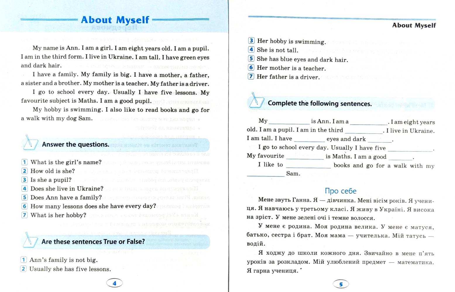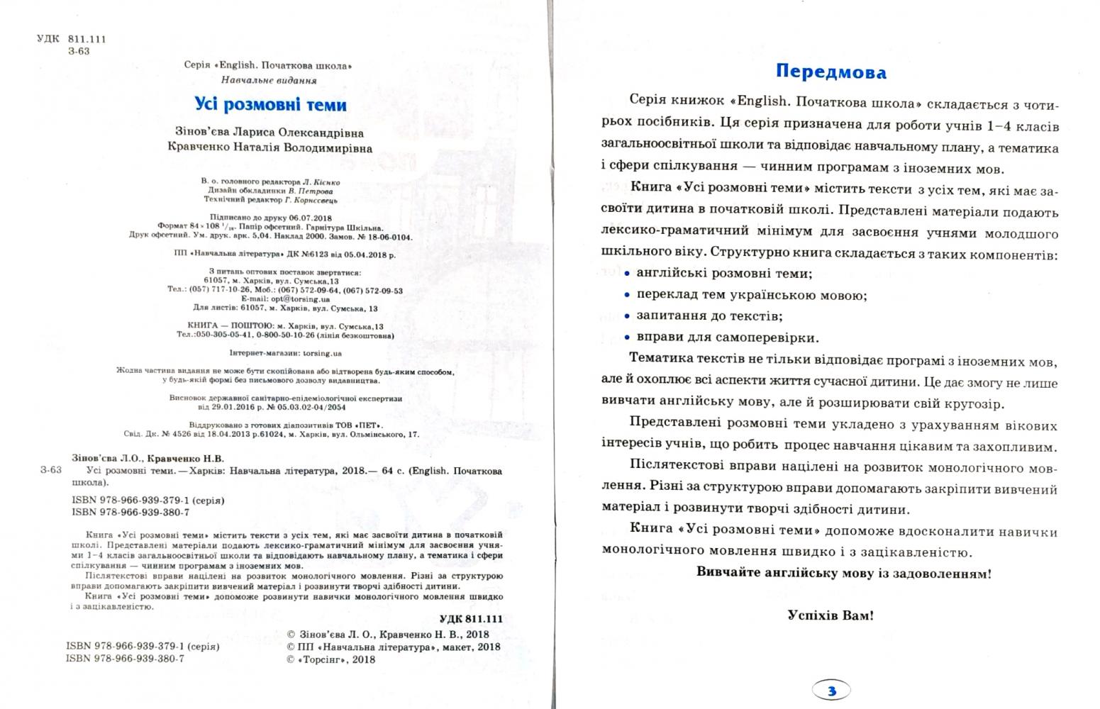 Книга «Усі розмовні теми» містить тексти з усіх тем, які має засвоїти дитина в початковій школі. Представлені матеріали подають лексико-граматичний мінімум для засвоєння учнями 1-4 класів загальноосвітньої школи та відповідають навчальному плану, а тематика і сфери спілкування — чинним програмам з іноземних мов. Післятекстові вправи націлені на розвиток монологічного мовлення. Різні за структурою вправи допомагають закріпити вивчений матеріал і розвинути творчі здібності дитини. Книга «Усі розмовні теми» допоможе розвинути навички монологічного мовлення швидко і з зацікавленістю.