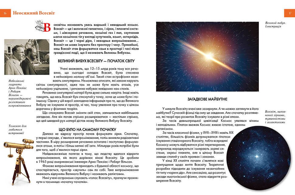 Далекі зоряні світи приваблюють людство своїми нерозгаданими таємницями, і так цікаво самому все розвідати! Отож запрошуємо в мандрівку неосяжним Всесвітом! Скільки зірок у нашій Галактиці? Як знайти чорну діру? Чи є життя на інших планетах?.. Десятки цікавих відкриттів, дивовижних фото з навколоземної орбіти читач знайде на сторінках нової енциклопедії «Космічні відкриття».