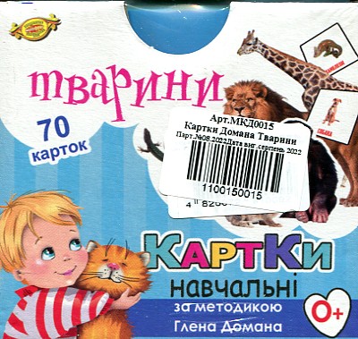 Тематичний набір “ТВАРИНИ” популярних карток за методикою Глена Домана (українською мовою). Унікальна система раннього розвитку дитини Глена Домана містить як найважливішу складову навчання дітей читанню в ранньому віці — з народження до 3—5 років. Основний елемент у цьому — картки з яскравою реалістичною картинкою на білому фоні з чітким текстом бажано червоного кольору. Важливо! Показуючи дитині картинку, вимовляти все слово цілком, не ділячи його на букви і склади. Займатися з картками можна щодня по 1—3 хвилини кілька разів на день вже з 1,5-місячного віку. Починаючи з 3—5 карток, щотижня їх кількість можливо збільшувати на 2—5 карток. До комплекту входять 70 карток із зображенням тварин: слон, ведмідь, панда, заєць, білка, миша, їжак, вовк, шакал, гієна, песець, койот, лисиця, осел, єнот, верблюд, лама, жирафа, лев, тигр, рись, пума, пантера, леопард, манул, гепард, ягуар, шимпанзе, мартишка, лемур, кенгуру, коала, вомбат, кабан, зебра, олень, козуля, антилопа, сайгак, бізон, буйвіл, лось, носоріг, крокодил, хамелеон, бобер, дикобраз, лінивець, скунс, норка, бурундук, горностай, ховрах, борсук, куниця, кріт, ящірка, черепаха, байбак, жаба, мангуст, вуж, кобра, свиня, вівця, кінь, корова, кіт, собака, коза. Комплектація: картки навчальні – 70 шт.