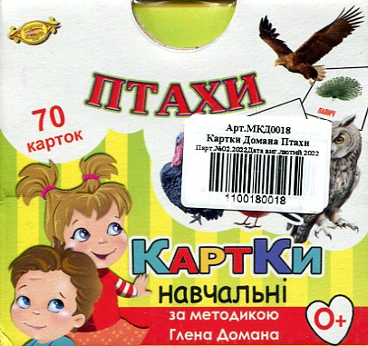 Тематичний набір “ПТАХИ” популярних карток за методикою Глена Домана (українською мовою). Унікальна система раннього розвитку дитини Глена Домана містить як найважливішу складову навчання дітей читанню в ранньому віці — з народження до 3—5 років. Основний елемент у цьому — картки з яскравою реалістичною картинкою на білому фоні з чітким текстом бажано червоного кольору. Важливо! Показуючи дитині картинку, вимовляти все слово цілком, не ділячи його на букви і склади. Займатися з картками можна щодня по 1—3 хвилини кілька разів на день вже з 1,5-місячного віку. Починаючи з 3—5 карток, щотижня їх кількість можливо збільшувати на 2—5 карток. До комплекту входять 70 карток із зображенням птахів: курка, гусак, качка, папуга, ґава, горобець, сова, дятел, орел, ластівка, лелека, сорока, індик, голуб, зозуля, соловей, шпак, канарка, страус, перепел, павич, лебідь, чайка, чапля, глухар, фламінго, беркут, пелікан, баклан, грак, дрізд, жайворонок, зяблик, синиця, стриж, тетерук, сич, чиж, чибіс, яструб, дрохва, альбатрос, галка, гриф, журавель, вивільга, ібіс, коловодник, кондор, шишкар, колібрі, пижик, рябчик, снігур, сапсан, фазан, фрегат, гагара, балабан, кречет, пересмішник, водомороз, вівчарик, горіхівка, бекас, крук, щиголь, пугач, лунь, гарпія. Комплектація: картки навчальні – 70 шт.