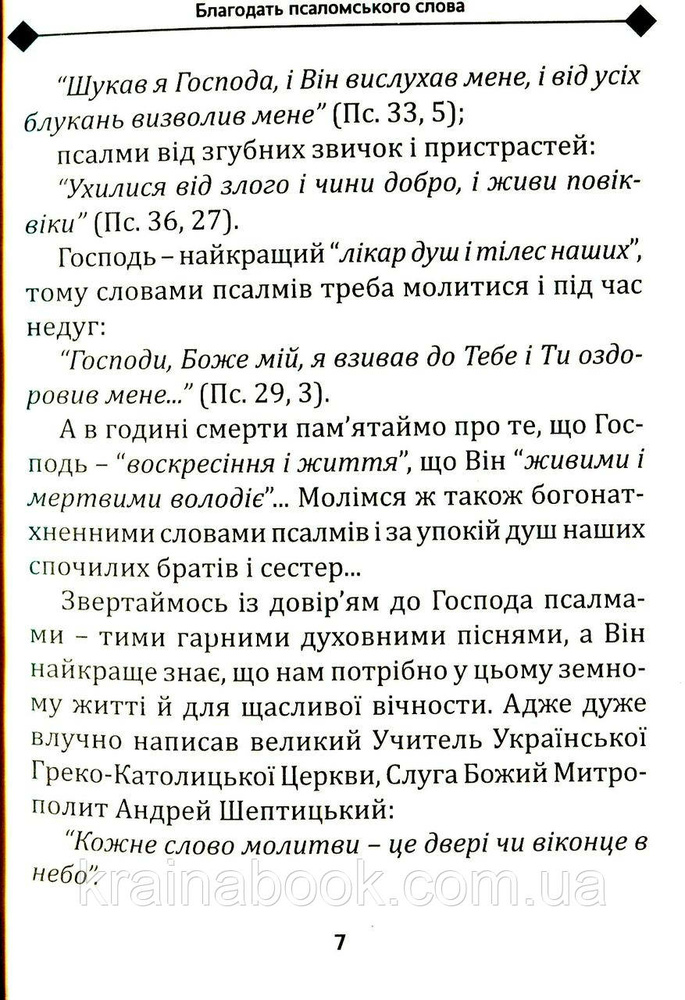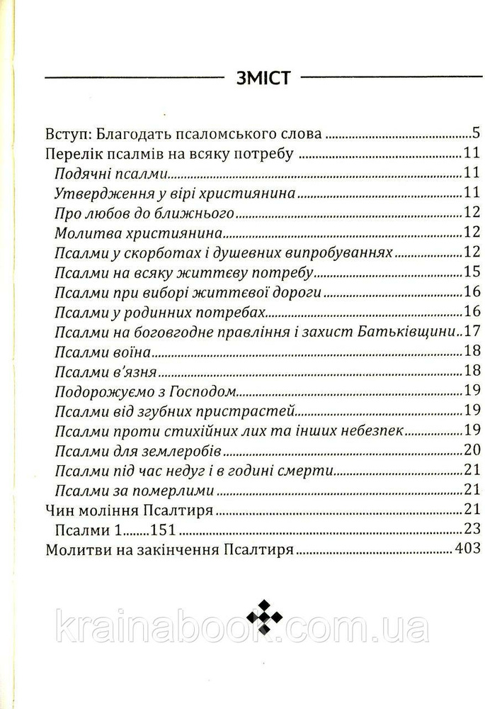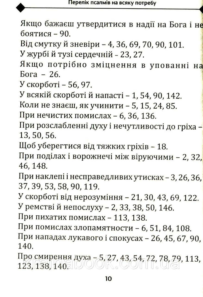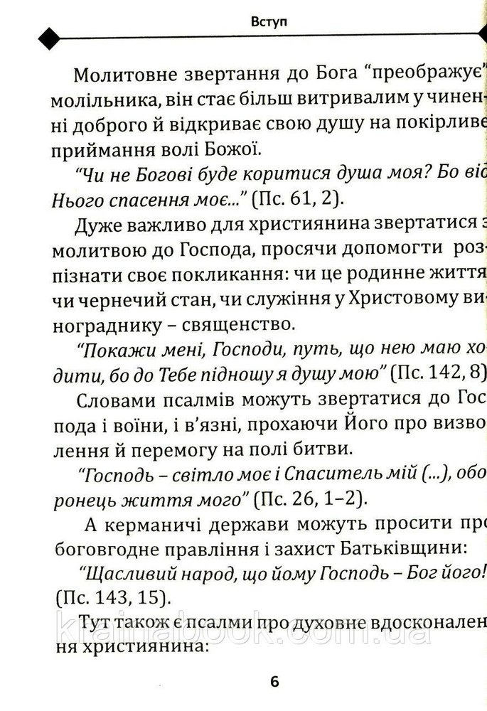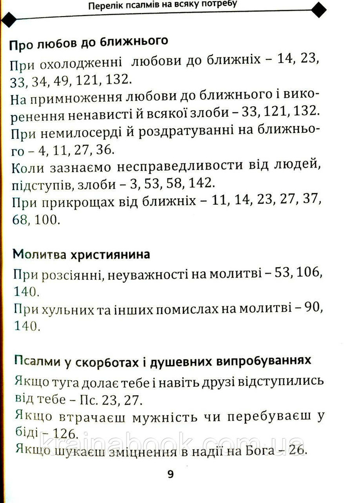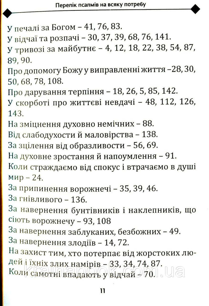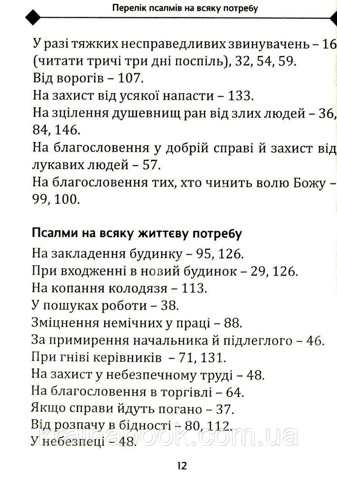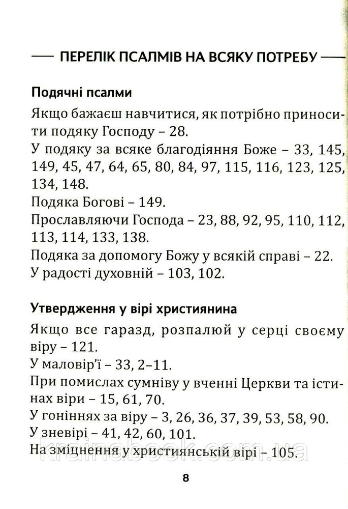 У Церкві Христовій, особливо на християнському Сході, а також і в нас, в Україні, існує прадавня практика читання окремих псалмів як молитов у певних життєвих потребах чи ситуаціях. Пропоноване видання “Псалми на різні потреби” містить молитви на початок і закінчення моління Псалтиря, тексти усіх псалмів, а також вказівки для молільників – у якій потребі яким псалмом молитовно звертатись до Господа.