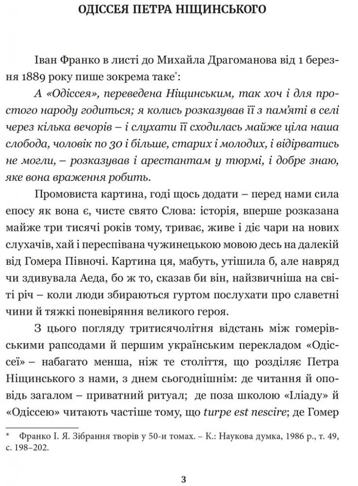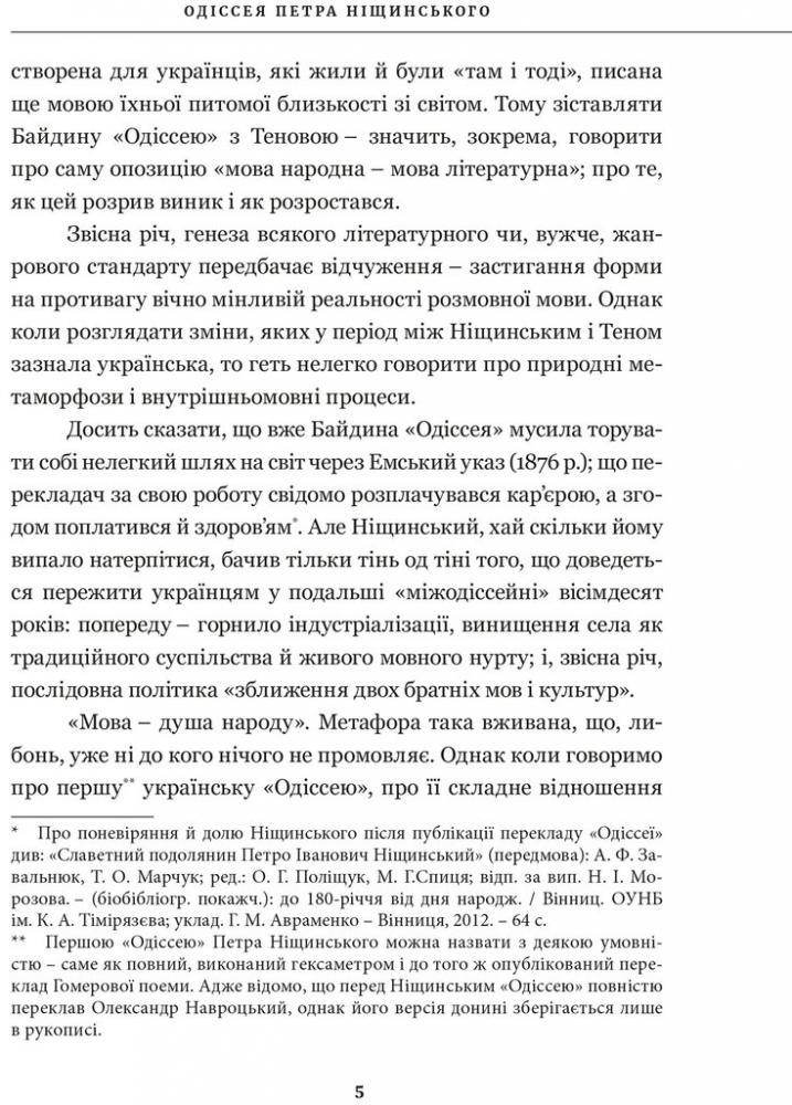 Гомерова «Одіссея» в перекладі Петра Байди-Ніщинського (1832–1896) вперше побачила світ понад сто років тому. Але з бігом часу цей шедевр українського художнього перекладу набув ще більшої ваги й цінності. Твір вабить поетичною сміливістю і майстерністю, живою і питомою українською мовою, а заразом – дає найщедріше підґрунтя для філологічних і перекладознавчих досліджень.