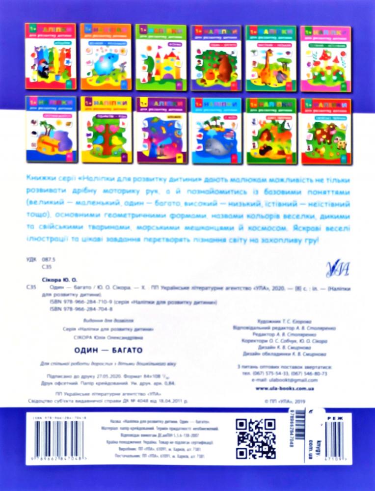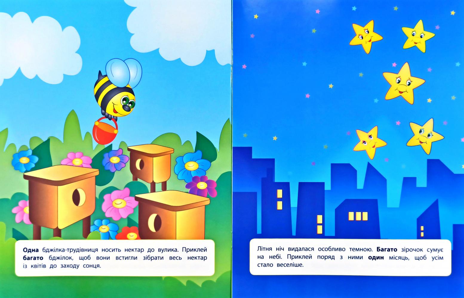 Пізнавати світ через гру — що може бути веселіше? Малюк з цікавістю познайомиться з поняттями «один» та «багато», граючись із наліпками. Дитина зможе потренуватися розрізняти один предмет та групу предметів, наклеїти барвисті наліпки та відповісти на питання, щоб перевірити себе. Граючись, малюк буде отримувати нові знання без нудьги й утоми!
