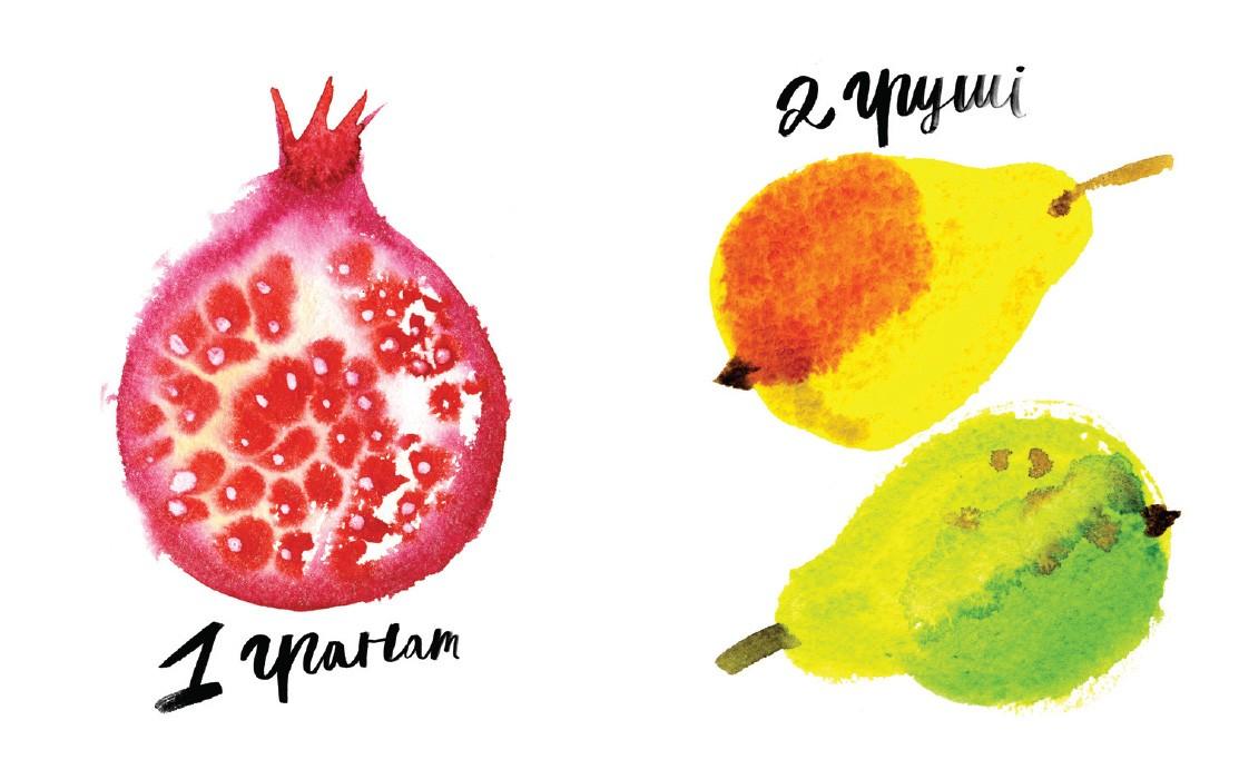Один гранат, дві груші, три скибки кавуна та шість бананів… Ця книжка-картонка з ілюстраціями Марічки Рубан навчить рахувати із задоволенням та апетитом.