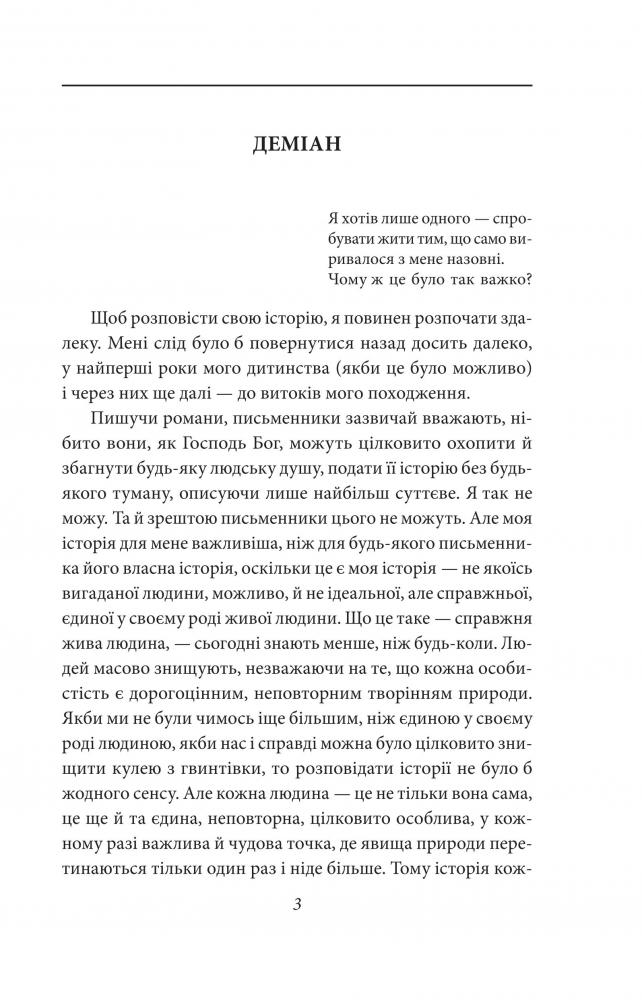 Роман «Деміан» — це глибоко особиста, суб’єктивно забарвлена сповідь героя. Вона виражає сподівання частини західноєвропейської інтелігенції, яка втратила віру у «стадні» ідеали попередньої епохи і стала на болісно важкий, але неминучий «шлях всередину», шлях утвердження своєї самобутності.