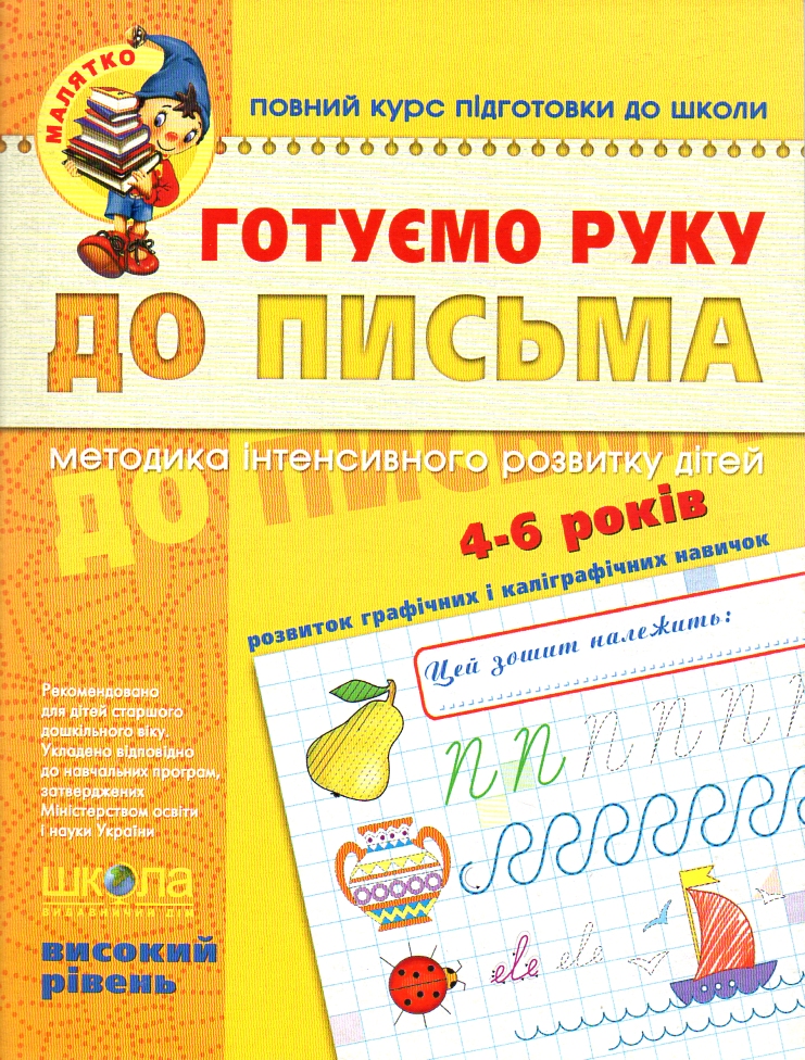 Робочі зошити серії «Малятко» допоможуть вам якнайкраще підготувати дитину до школи. Розроблені педагогами-практиками, вони повністю відповідають сучасним методичним вимогам та санітарно-гігієнічним нормам, ураховують вікові фізіологічні та психологічні особливості дошкільників. Скомпонований за заняттями навчальний матеріал вичерпно охоплює обсяг умінь та знань, рекомендований дитині для засвоєння впродовж навчального року. Посібники серії однаково ефективно можуть бути використані як для індивідуальних занять, так і для колективної роботи з дітьми у дошкільних навчально-виховних закладах. Головна мета цього зошита – підготувати малюка та його руку до оволодіння письмом за допомогою найсучасніших методик та комплексу спеціально дібраних вправ. Ці вправи допоможуть зміцнити ще слабкі в такому віці м’язи кисті і пальчиків малюка, нададуть їм злагодженості і скоординованості, розвинуть м’язову пам’ять руки. Для цього дитині пропонуються різноманітні вправи на обведення та побудову різних фігур і графічних елементів, їх штрихування та розфарбовування. У зошиті також наведено вправи з написання фрагментів букв – як друкованих, так і каліграфічних.