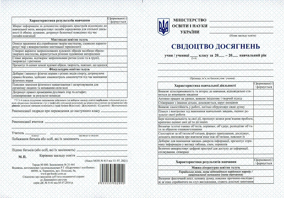 Свідоцтво досягнень учня 3 -4 кл. оновлені